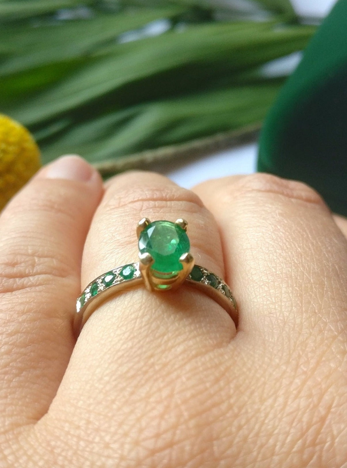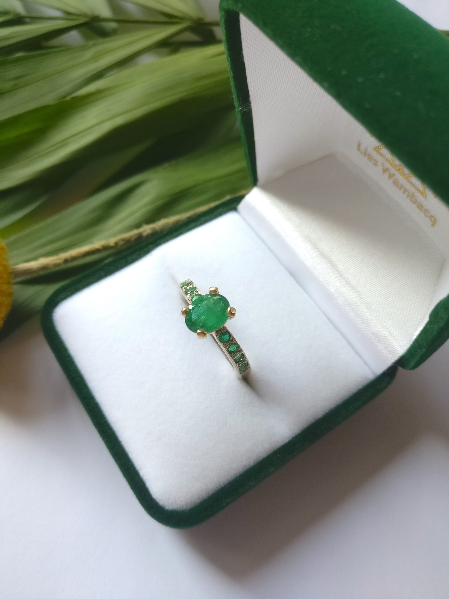18k wit en geel gouden ring gezet met grote ovalen smaragd (hoge kwaliteit uit Zambia 1,02ct )+ 8x smaragd briljant geslepen gezet in ringband met een doorsnede van 2mm.