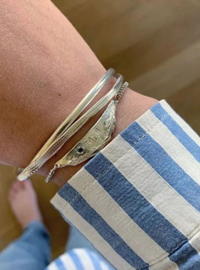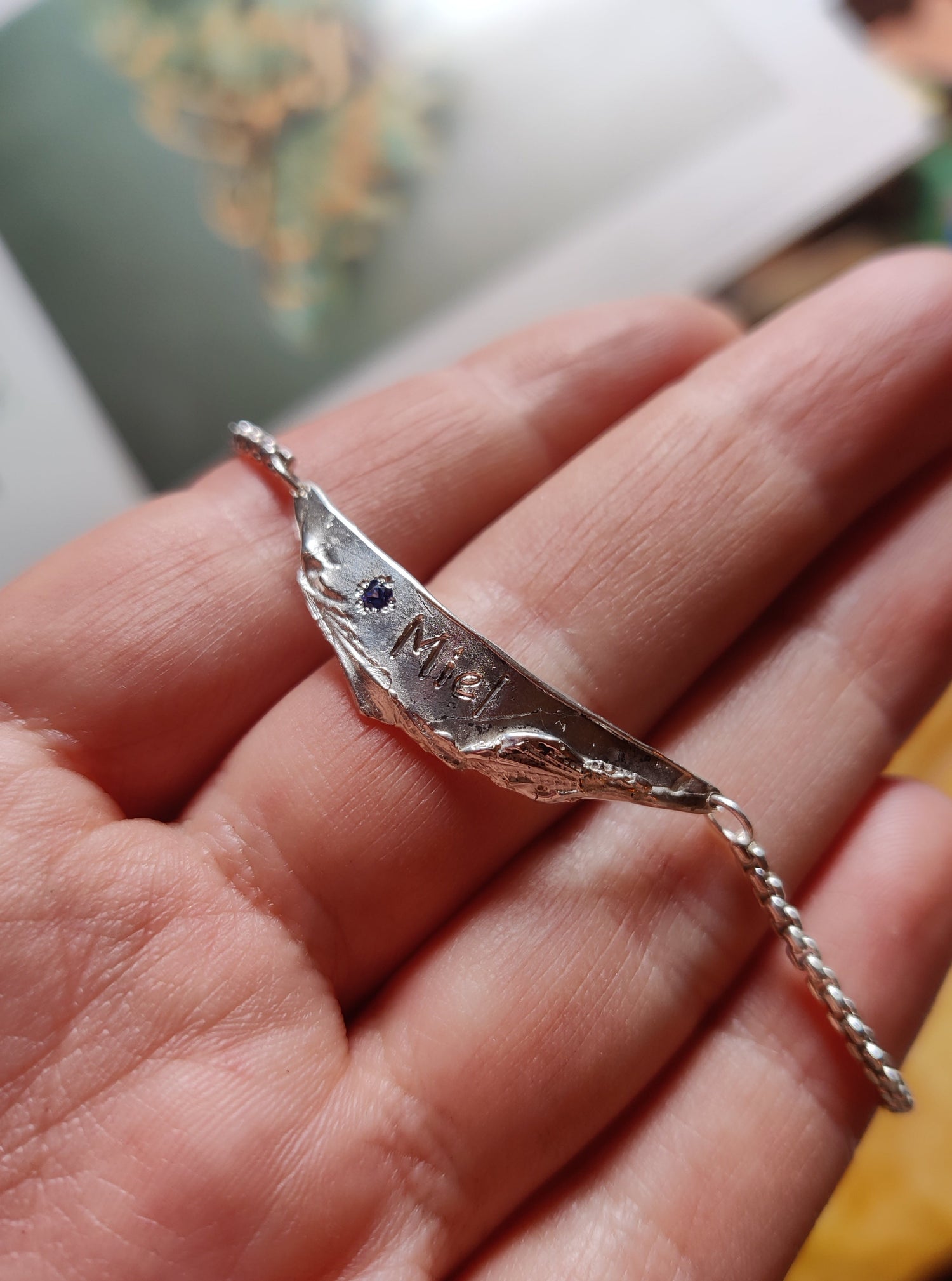 Ik maakte voor haar deze zilveren armbanden. In één verwerkte ik de naam van hun kindje in het lettertype van hun geboortekaartje. Als kers op de kroon werd er een tanzaniet in gezet, de geboortesteen van de maand december.