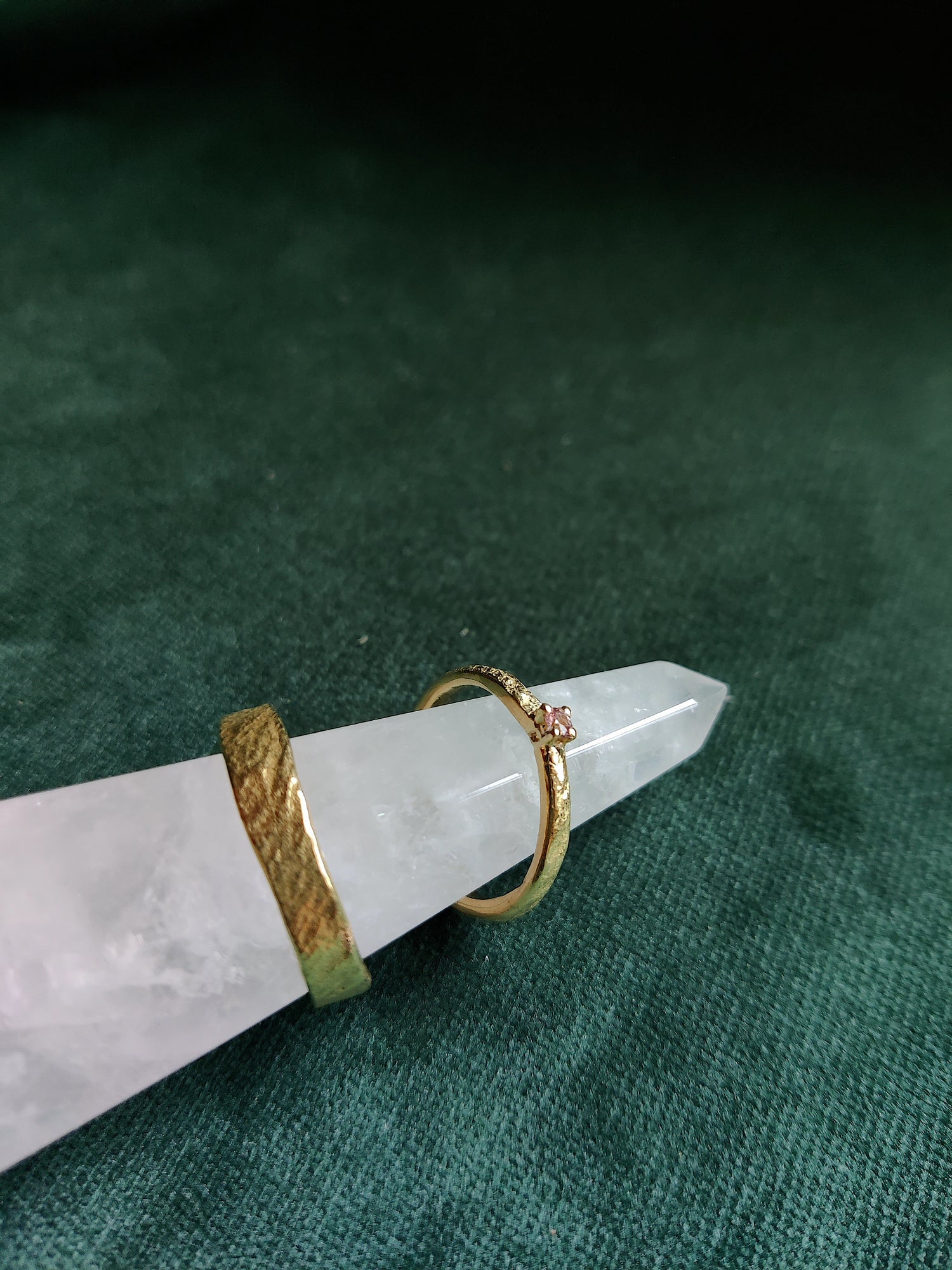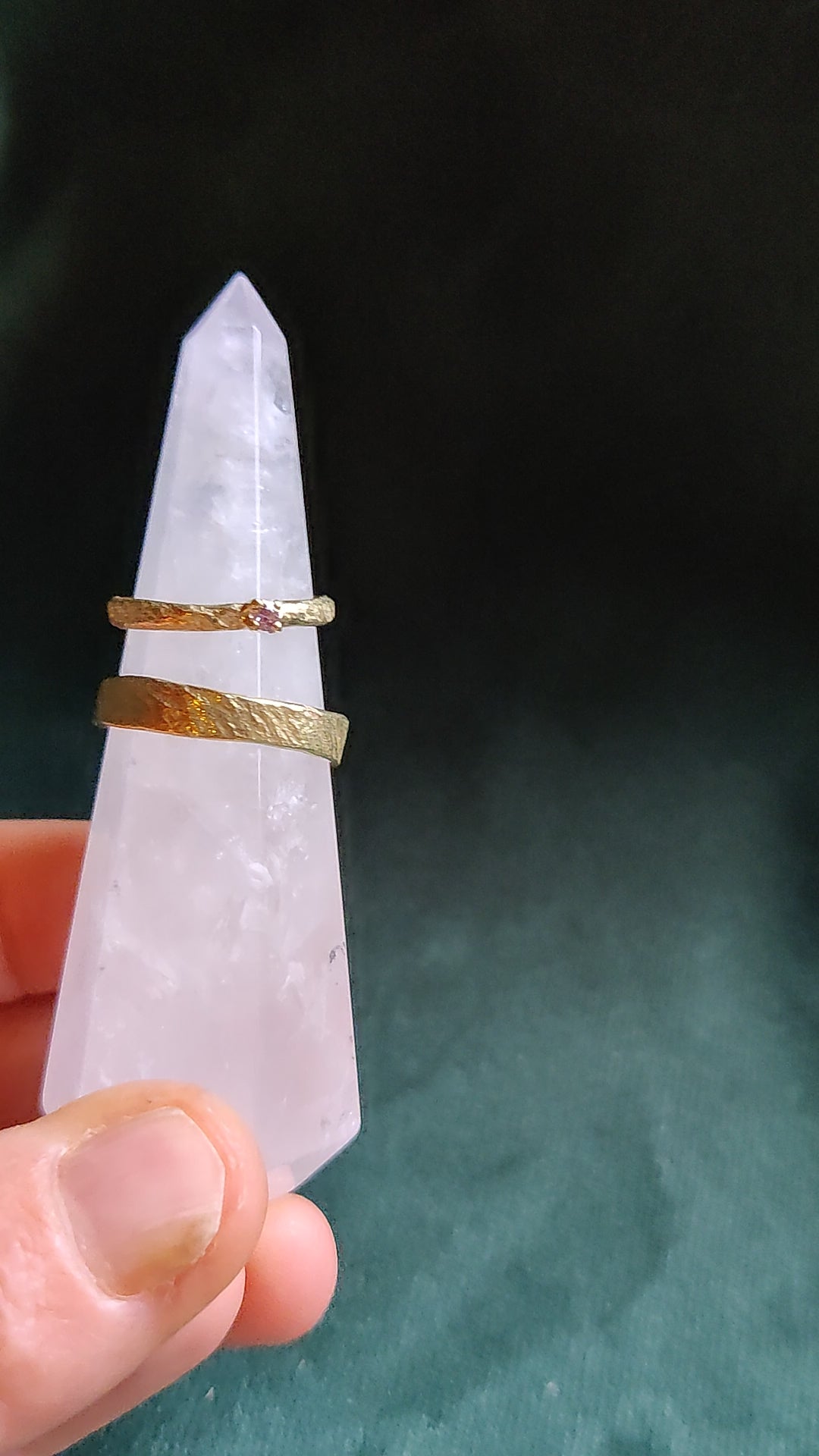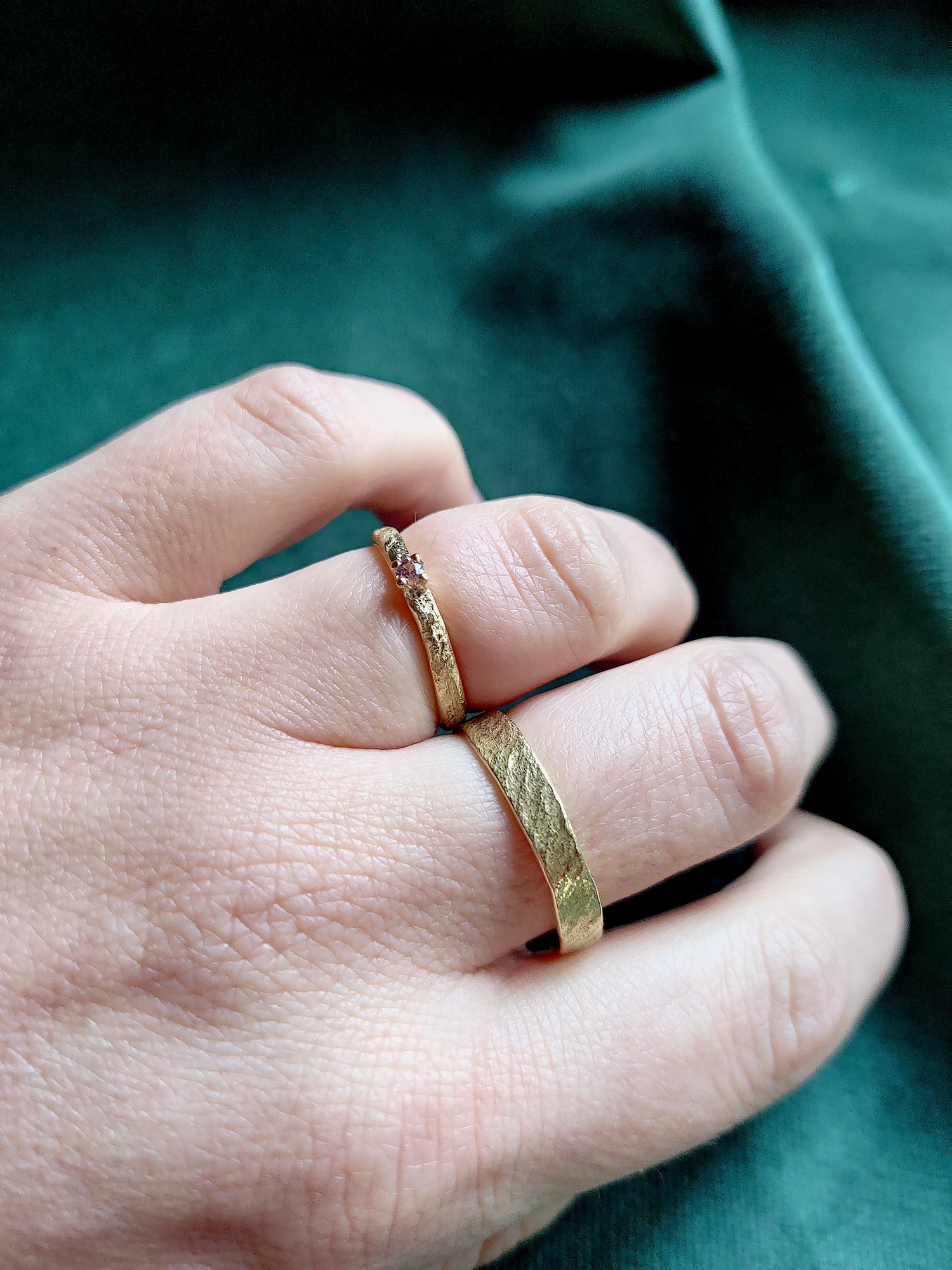Het zijn klassieke trouwringen met een twist. In de trouwring voor haar zit er een licht paarse saffier bovenop de band voor extra schittering. De trouwringen lijken wel stukjes schors van een boom.