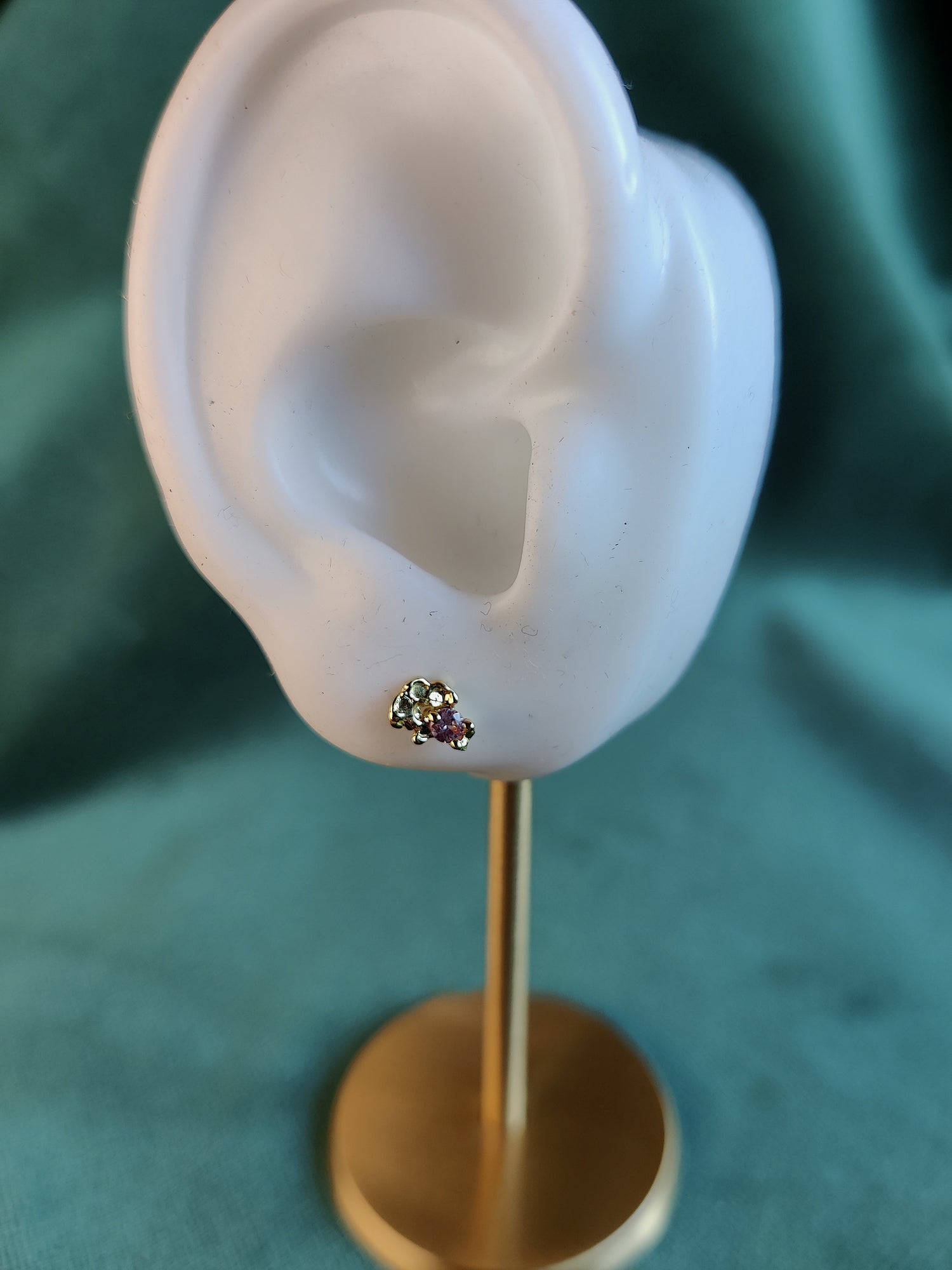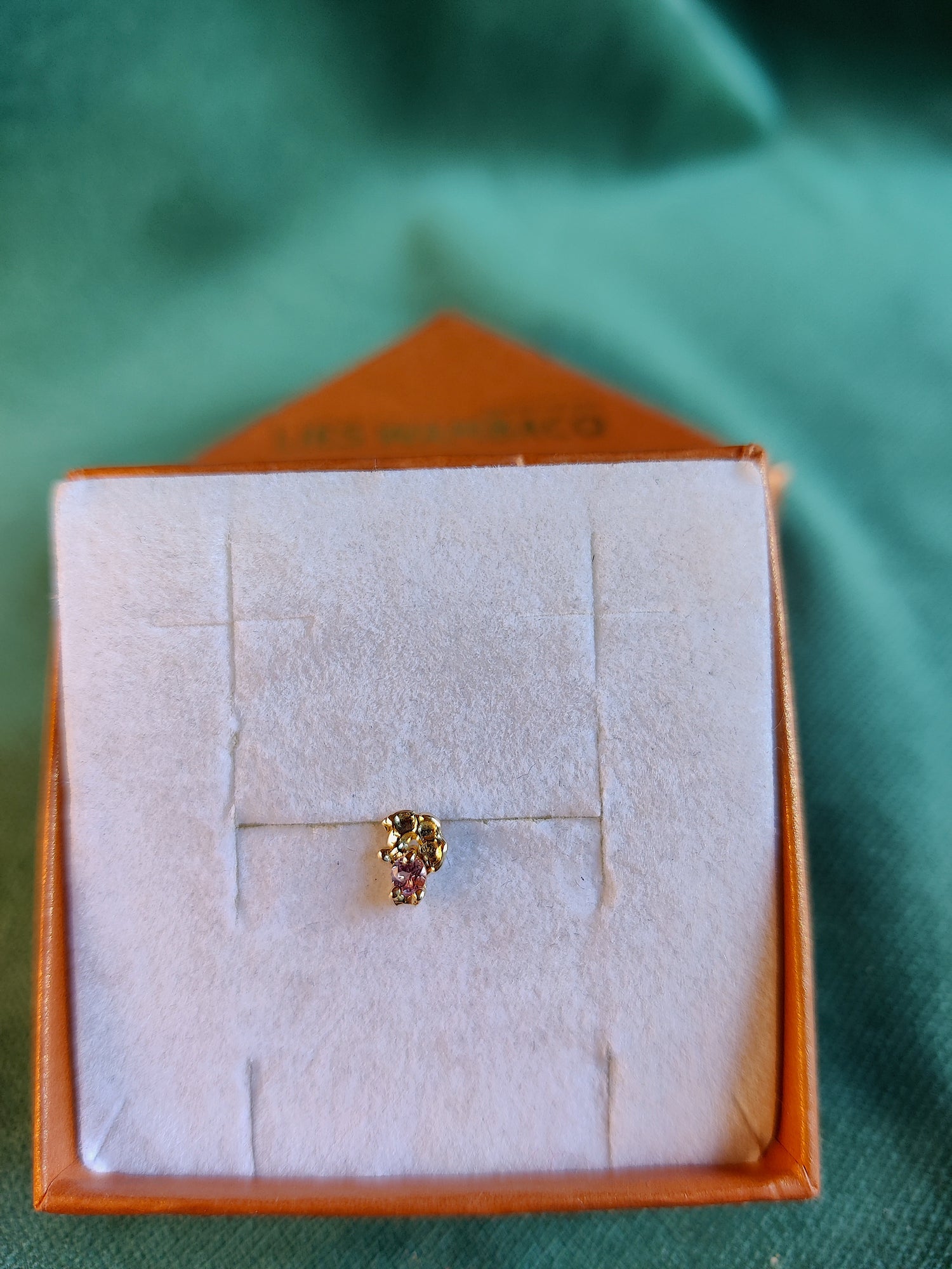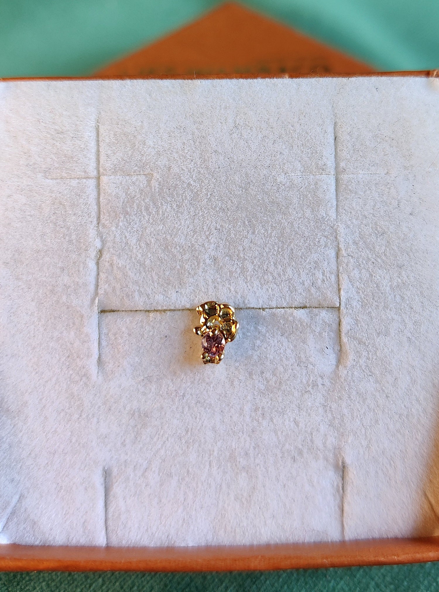 Ear stud in geelgoud 18K met kleine roze saffier. Een kleine geel gouden oorsteker omringd met een structuur, waar een roos steentje in zit.