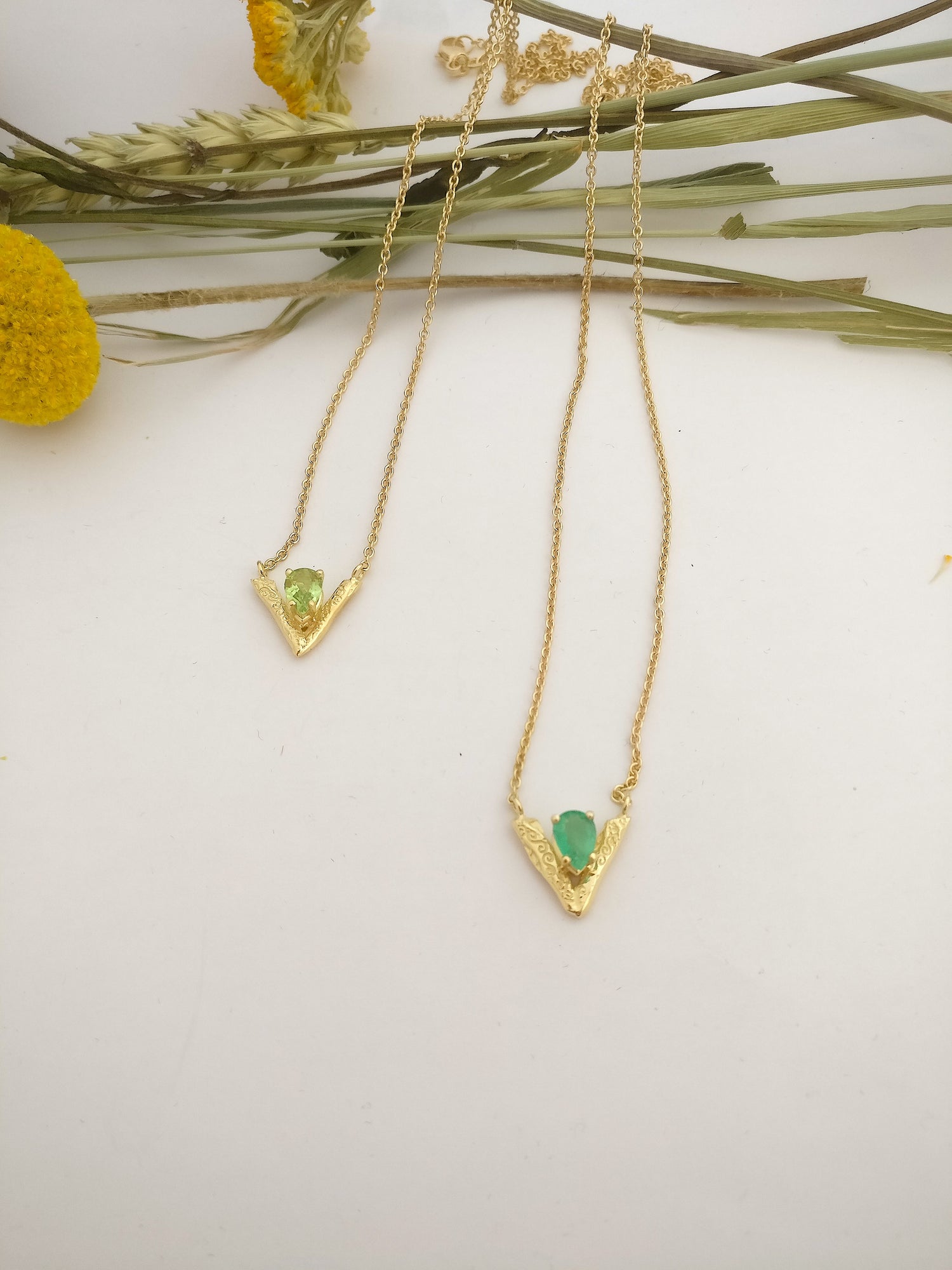 Deze kettingen werd op maat gemaakt. S. en L. hun oma stierf en samen met hun mama lieten ze deze kettingen maken van haar oud goud als herinnering aan haar. De dochters werden allebei geboren in mei, en kozen hun geboortesteen smaragd, de mama in augustus en in haar ketting kwam een lichtgroene peridoot.