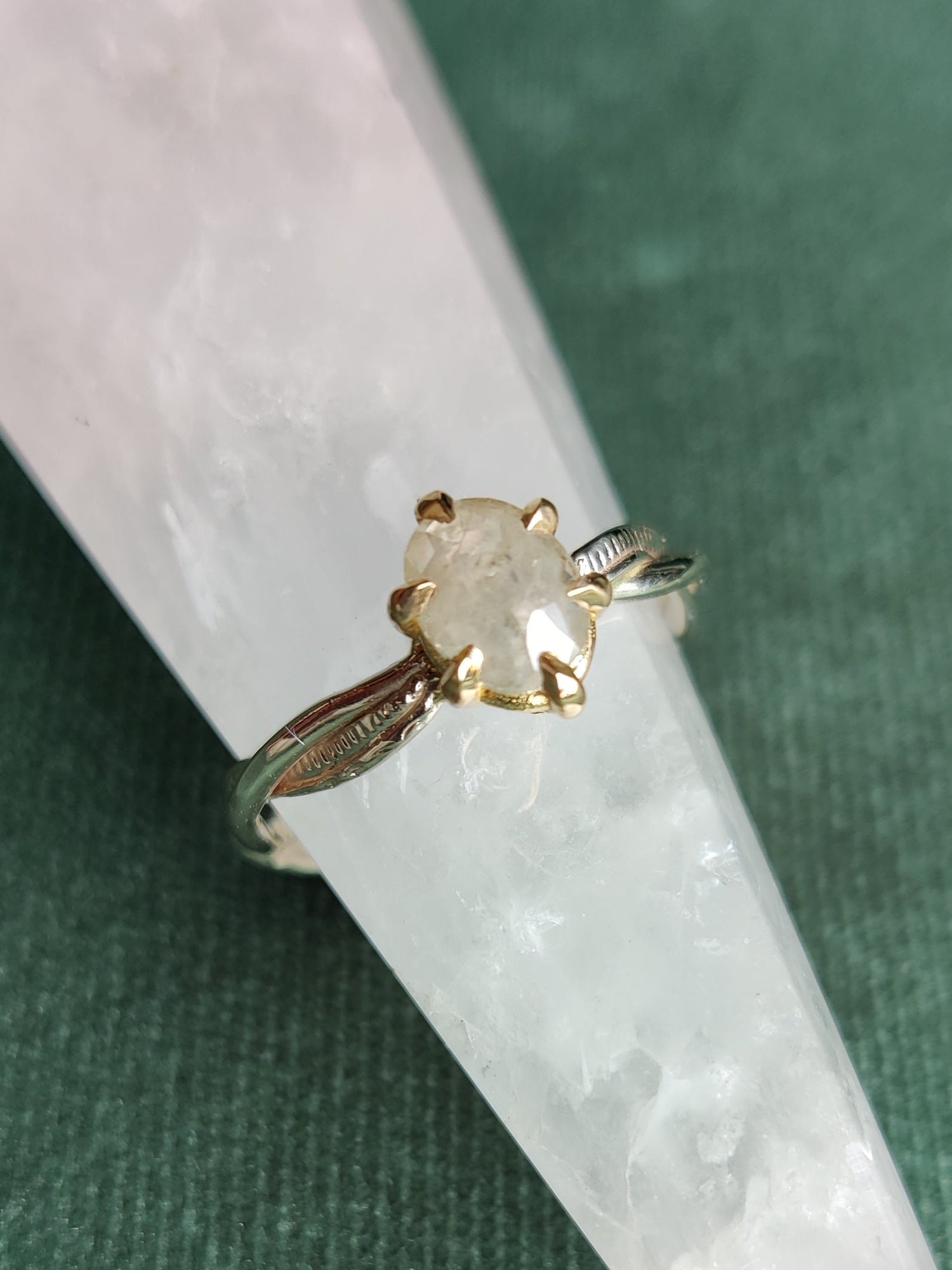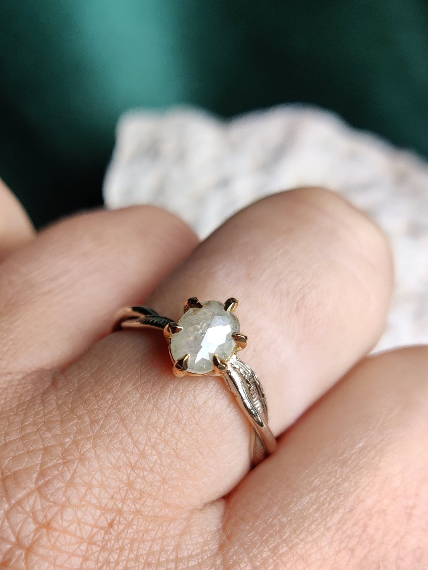 18k geel gouden zetkast met met wit gouden ringband en ice diamant 0,77ct. Dit is een natuurlijke diamant met een heleboel insluitseltjes in. Hierdoor is de steen niet transparant, maar eerder opaak. Het is een heel bijzondere steen.