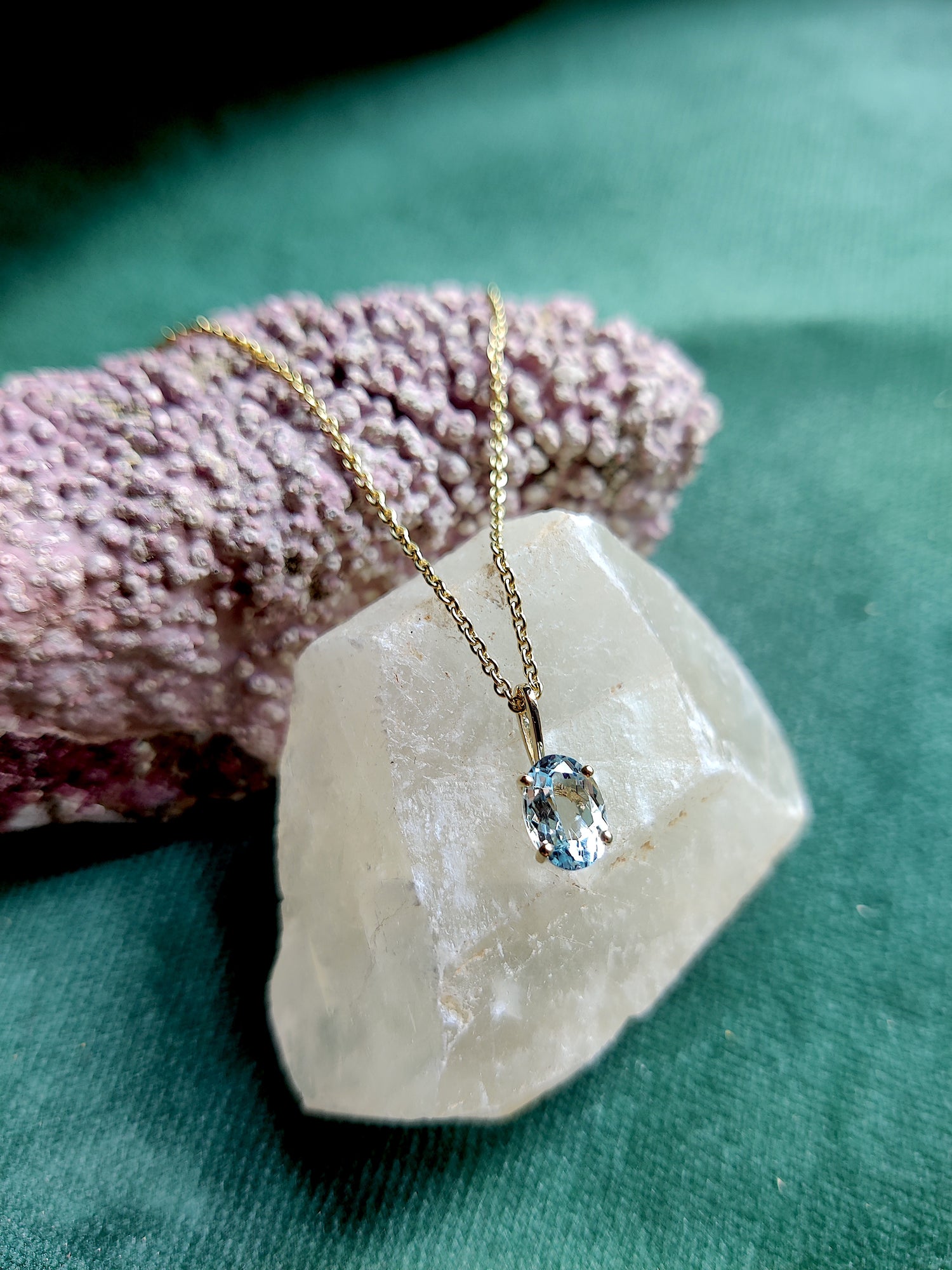 Een lichtblauwe edelsteen gevat in een geelgouden hangertje. Fijne pootjes rond een ovalen steen met facetten. Prachtig in zijn eenvoud.