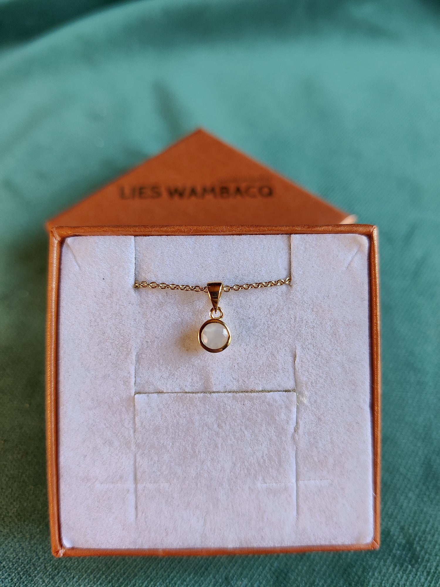 Een klein gouden hangertje met een witte maansteen, de geboortesteen van de maand juni. Het witte steentje is een kleine eye catcher die vervat zit in een gouden potje. Dit is een wat moderner hangertje, perfect als cadeautje voor een mama of voor iemand die geboren is in de maand juni.