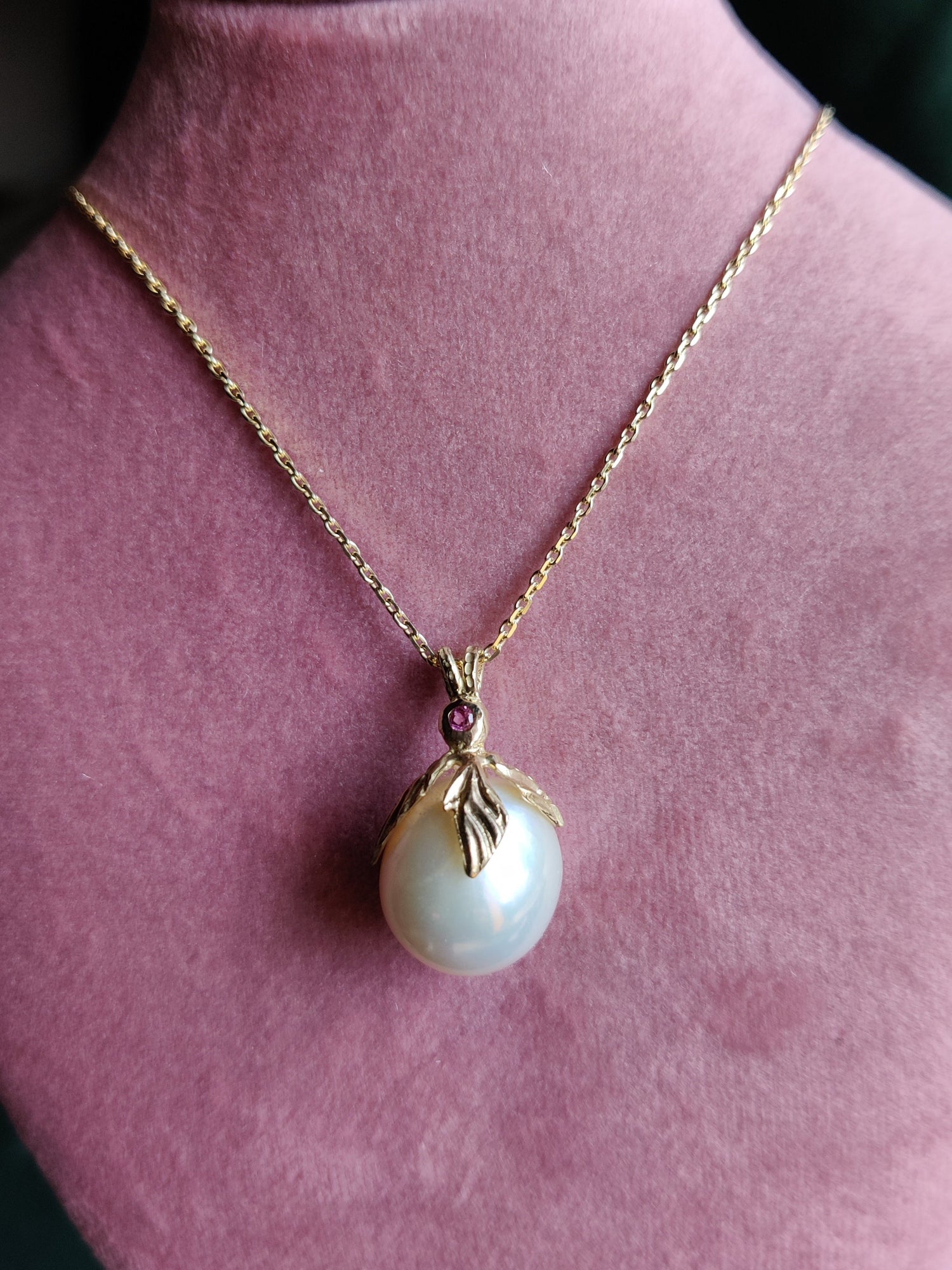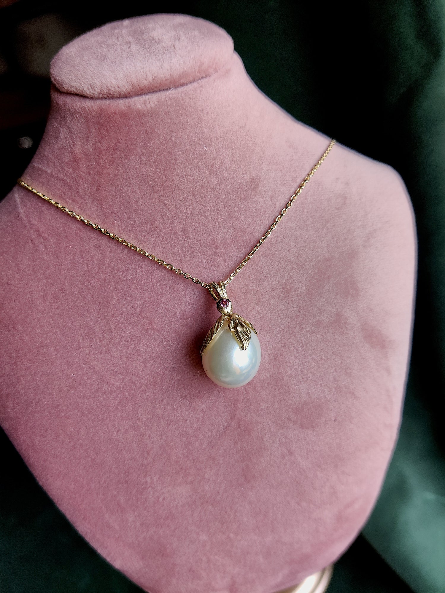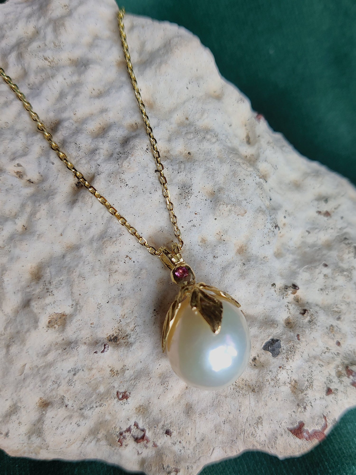 Hanger in 18k geel goud met druppelvormige parel en roze rubeliet van 1,9mm(= roze toermalijn).