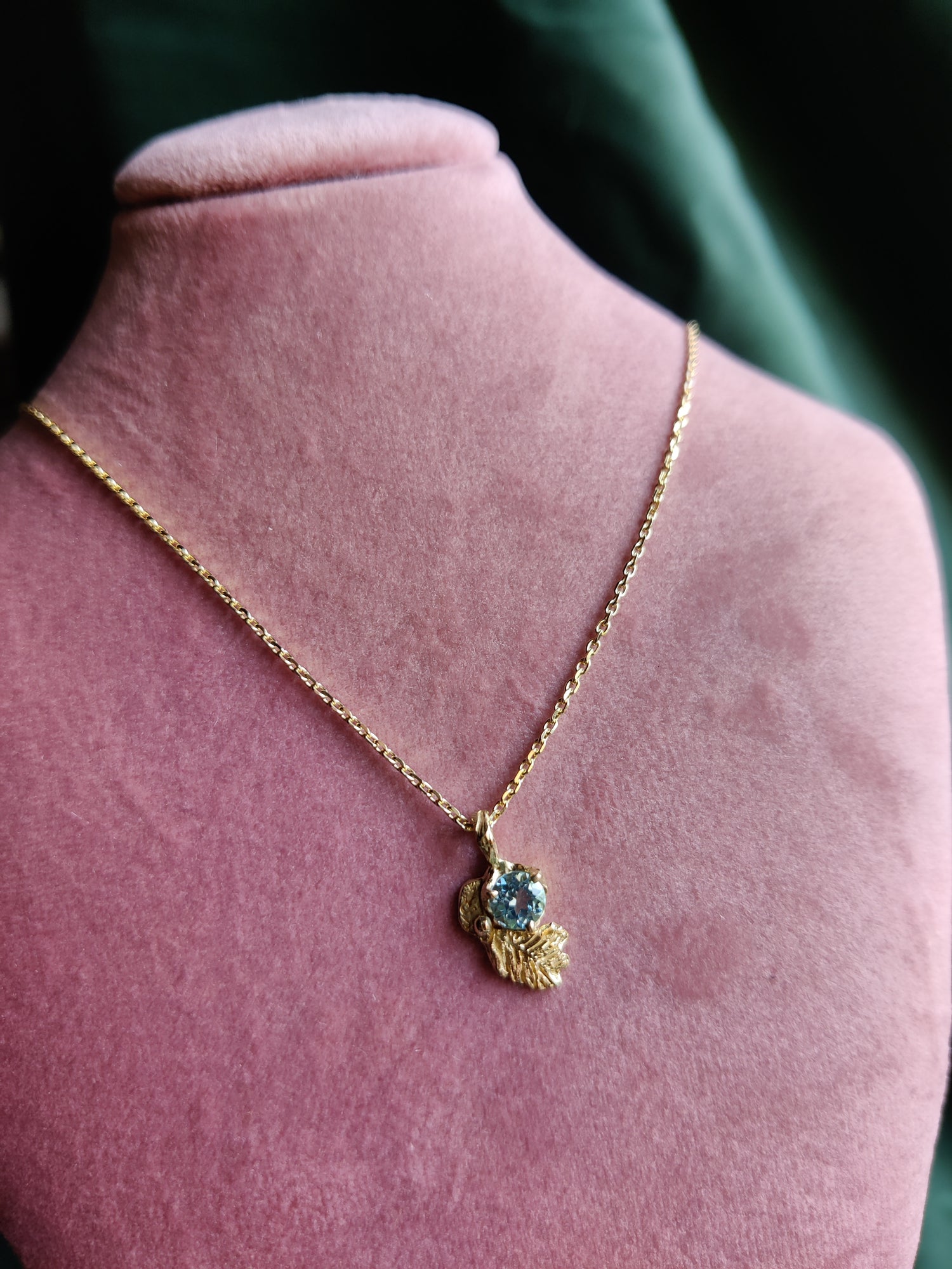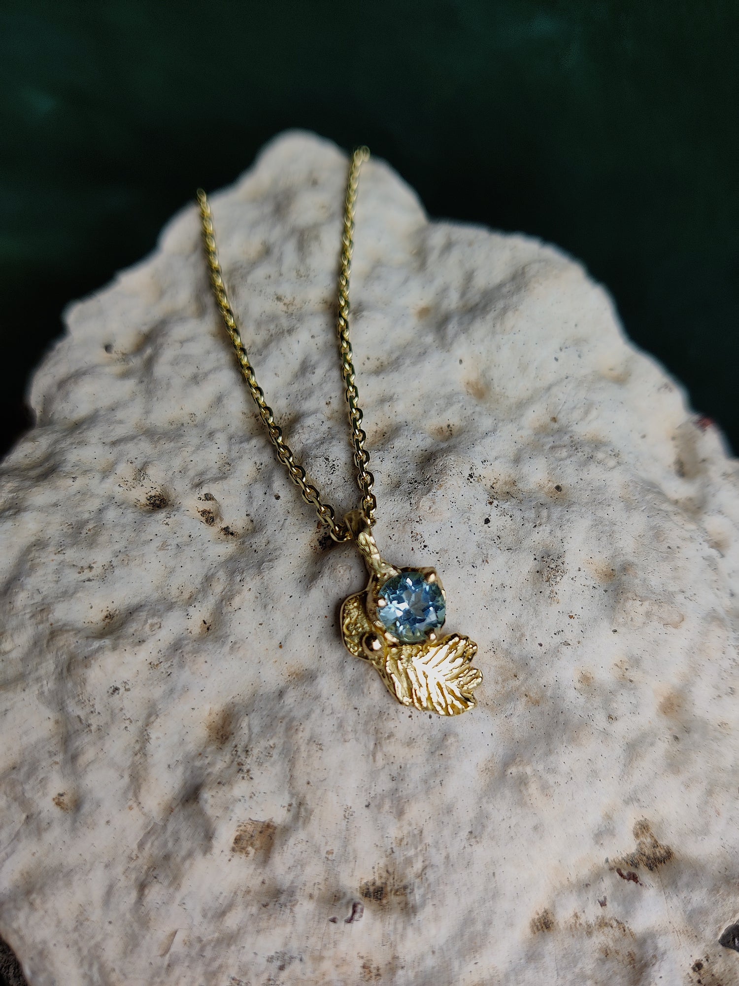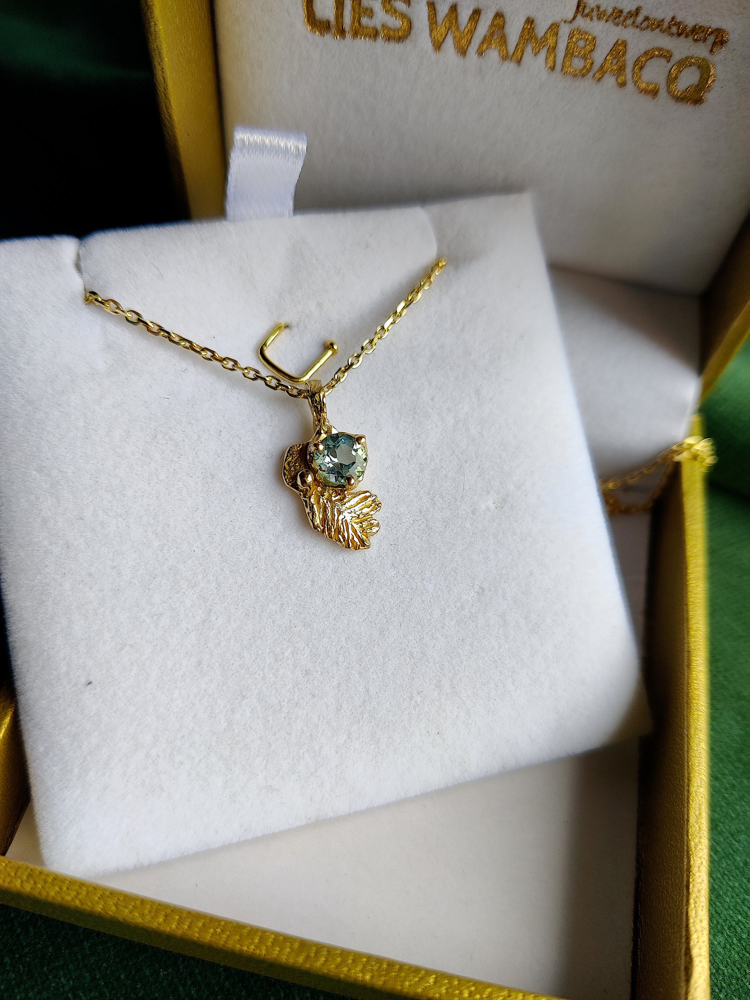 De hanger werd gemaakt met de verloren was techniek en er is er maar ééntje van. Het is een blaadje met daarvoor een fel blauwe steen.