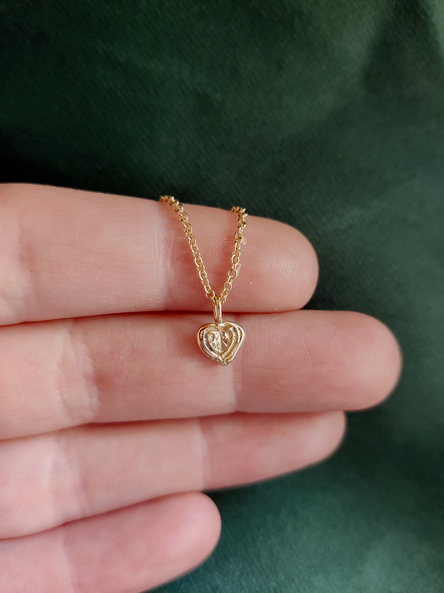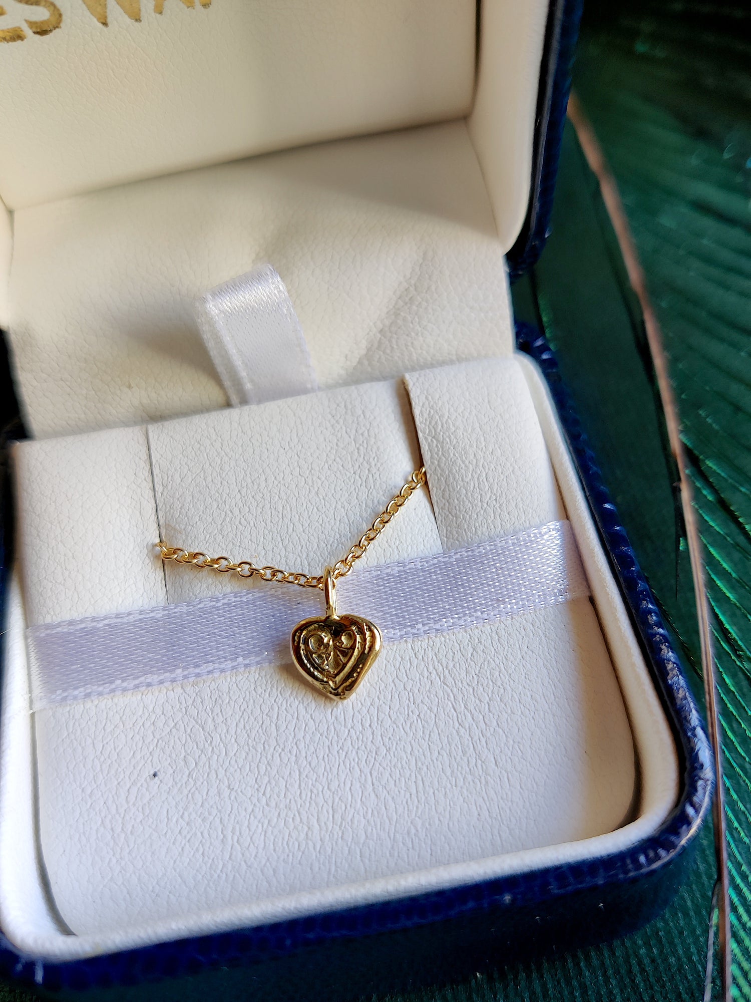 Het is een hanger in hart vorm. Een klein hartje met patroon op, het lijkt wel van een Arabische prinses.