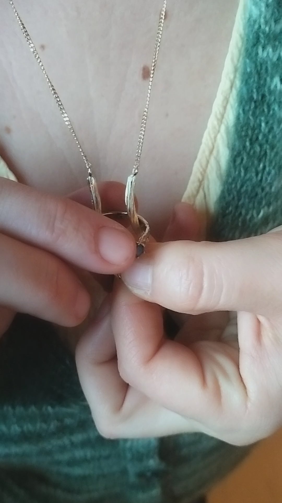 14k geel gouden hanger die als ringhouder kan gedragen worden als arts, verpleegster, pottenbakster, ... . Lengte van de ketting 50cm. Zo blijft de hanger goed onder de kleding hangen wanneer nodig.