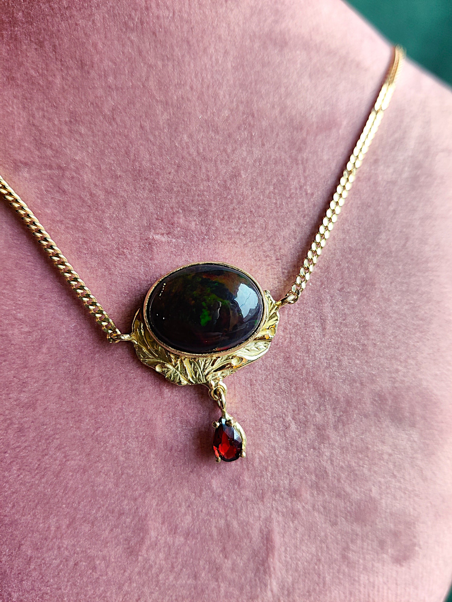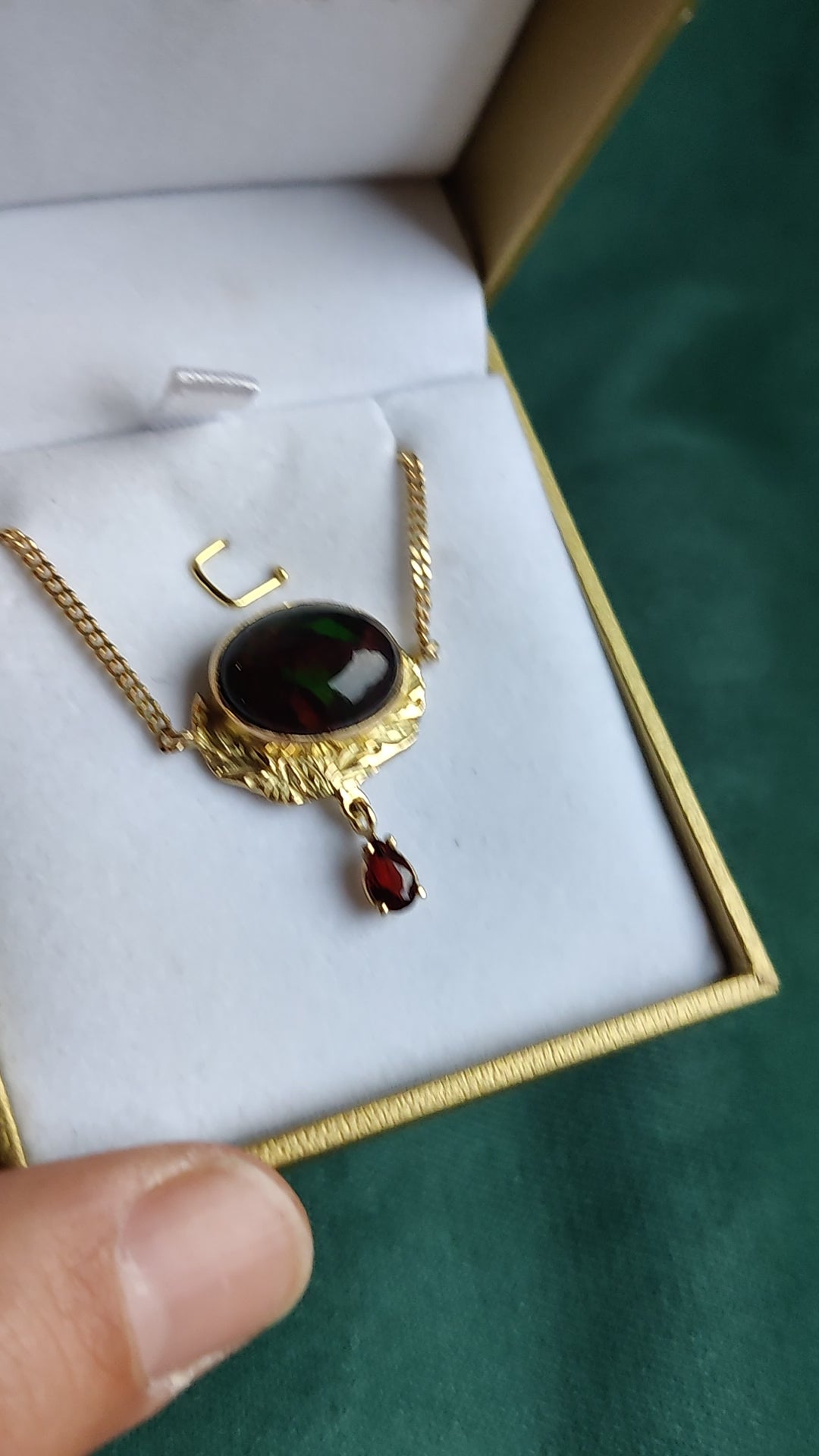 18k geel gouden ketting met een ovalen opaal 5.93ct (15,4x12mm) en druppel granaat (6x4mm). De totale lengte van de ketting is 52cm.