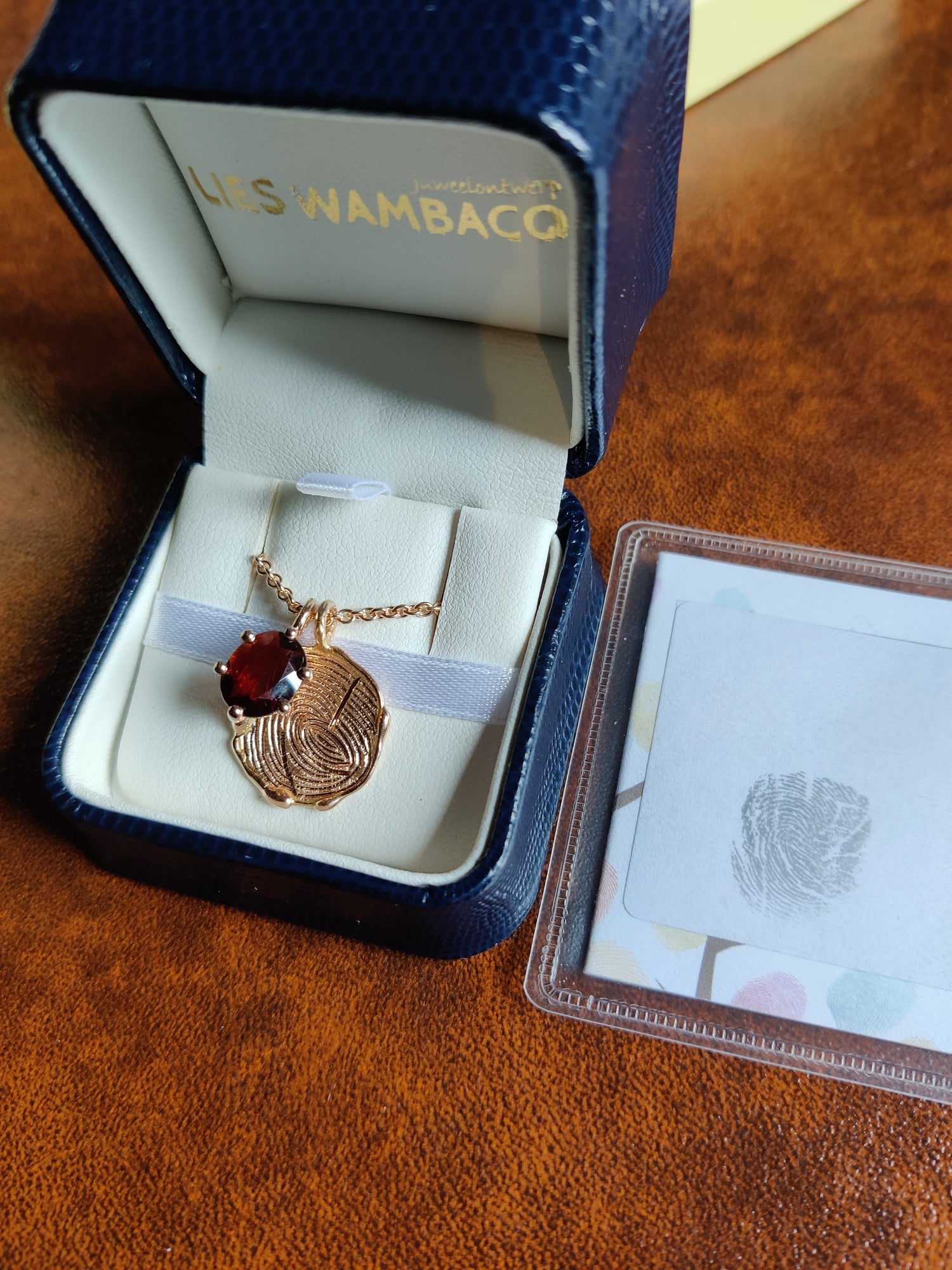 K. verloor haar mama en wou een mooi aandenken om haar te koesteren. Ze hadden in het uitvaartcentrum haar vingerafdruk in inkt gezet. De graveur kopieerde deze met de hand in deze rood gouden hanger.