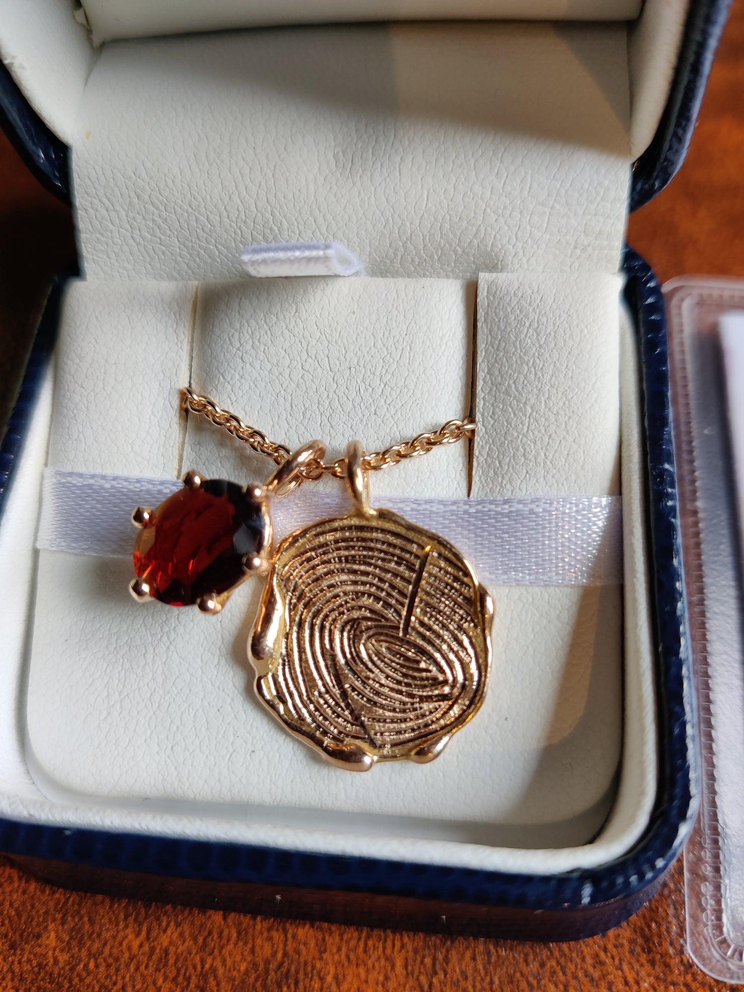 Rouw juweel in 18k rood goud en granaat met vingerafdrukken.