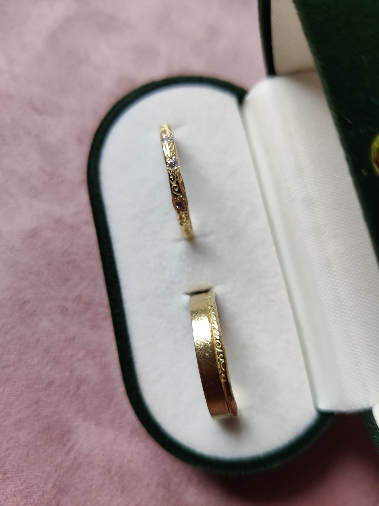 Voor hun trouwringen lieten ze een paar geel gouden ringen maken die mooi gegraveerd zijn. Het is een paar dat perfect samen past, maar ook toch weer apart is. Organisch, romantisch, verfijnd.
