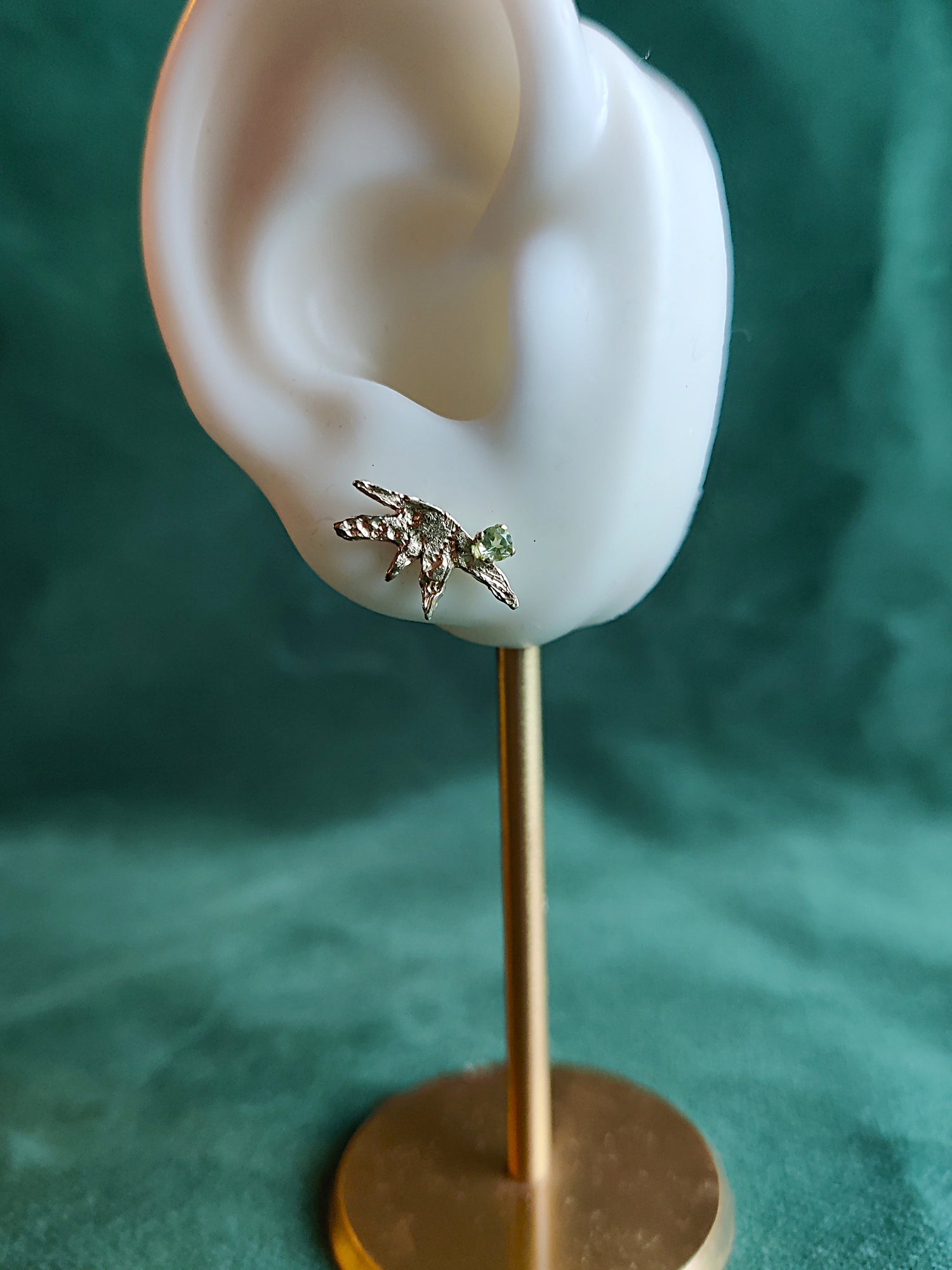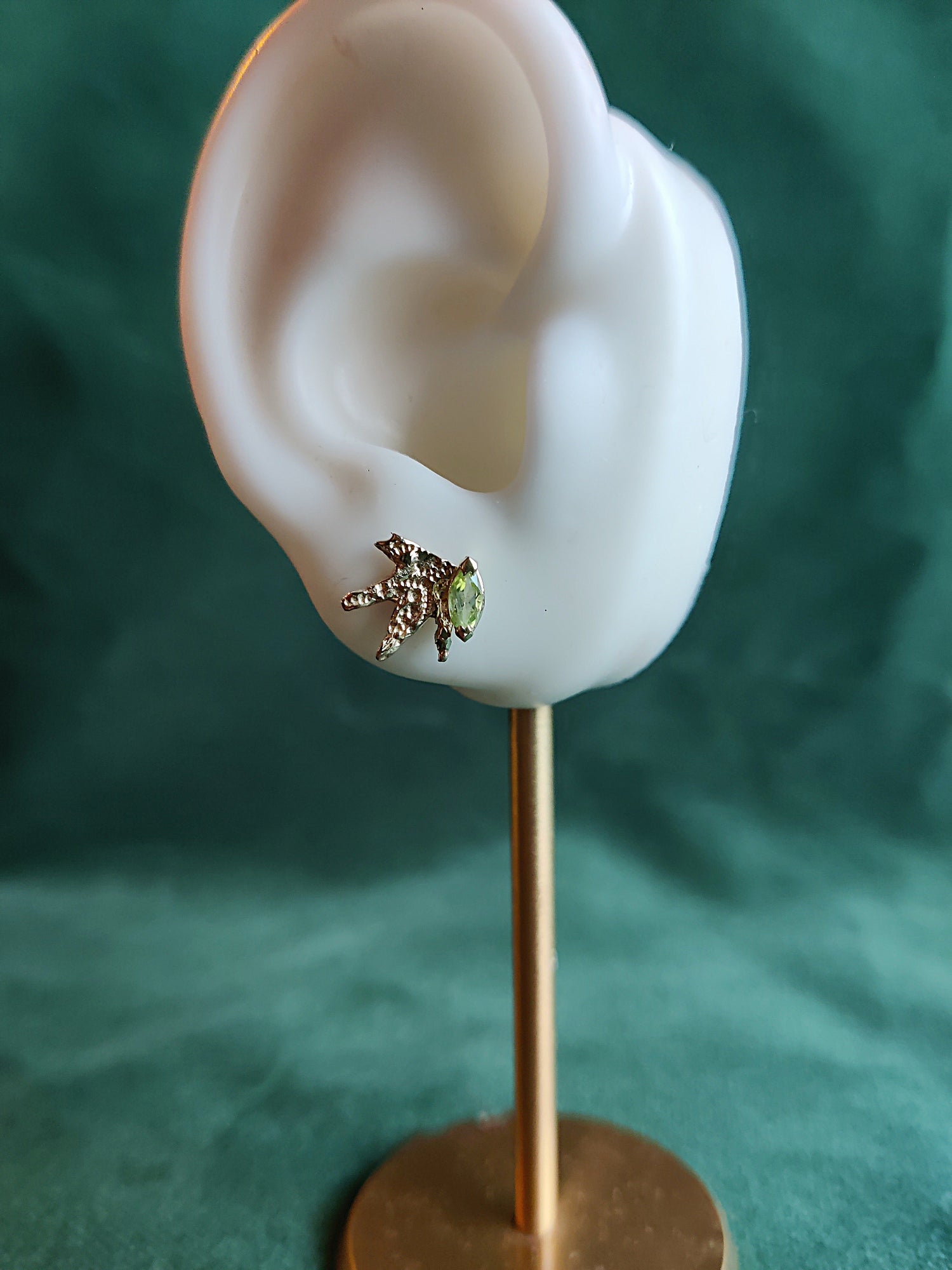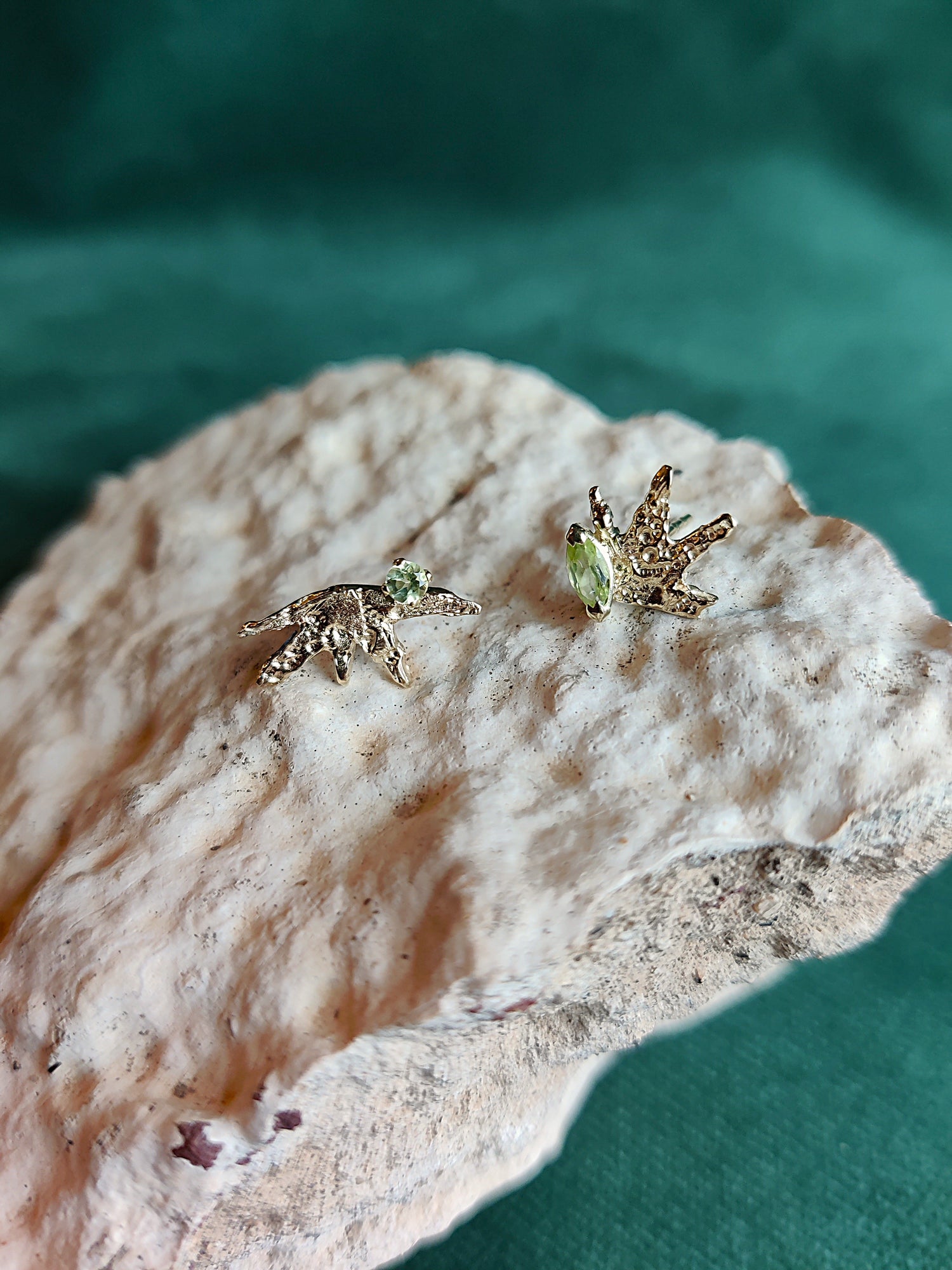 Oorsteker in 14k geel goud waarvan 1 met een markies peridoot 5x2mm en de andere met een ronde peridoot 2.5mm.