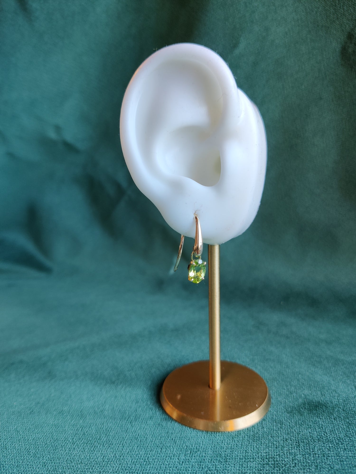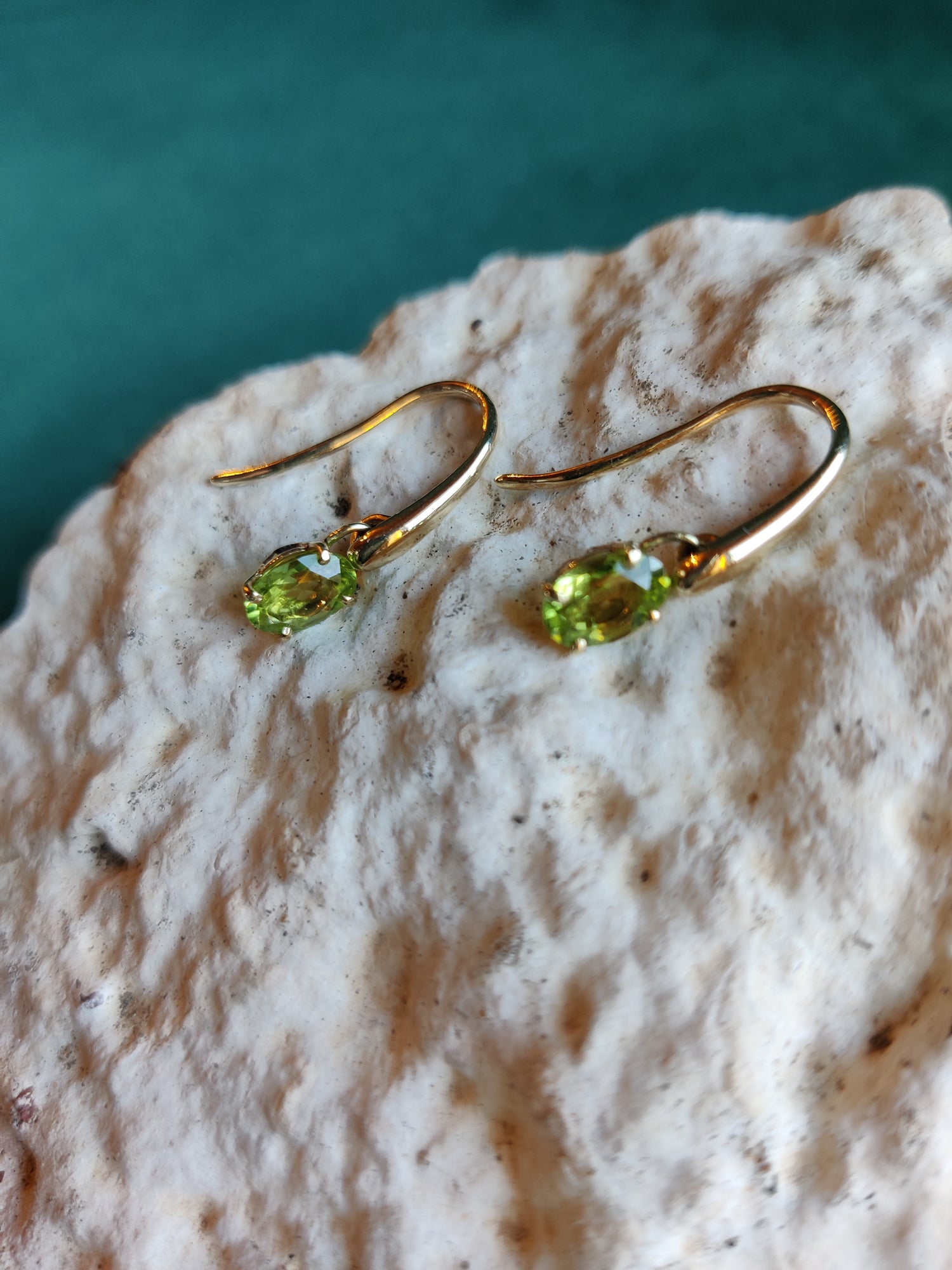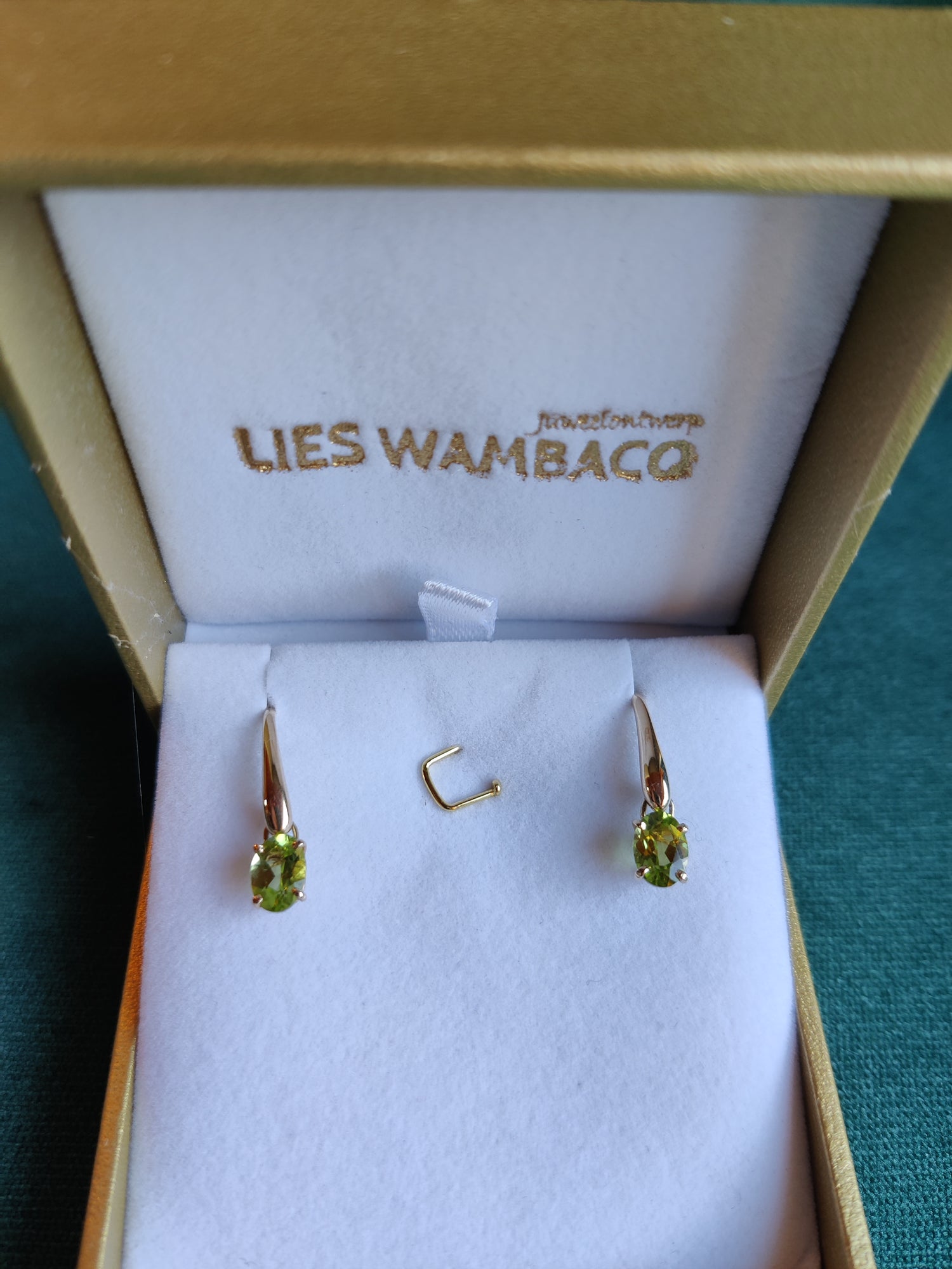 Oorhanger in 14k geel goud met ovale peridoot van 7x5mm. De peridoot hang los onder de oorhanger waardoor deze leuk beweegt en het licht vangt bij het dragen.