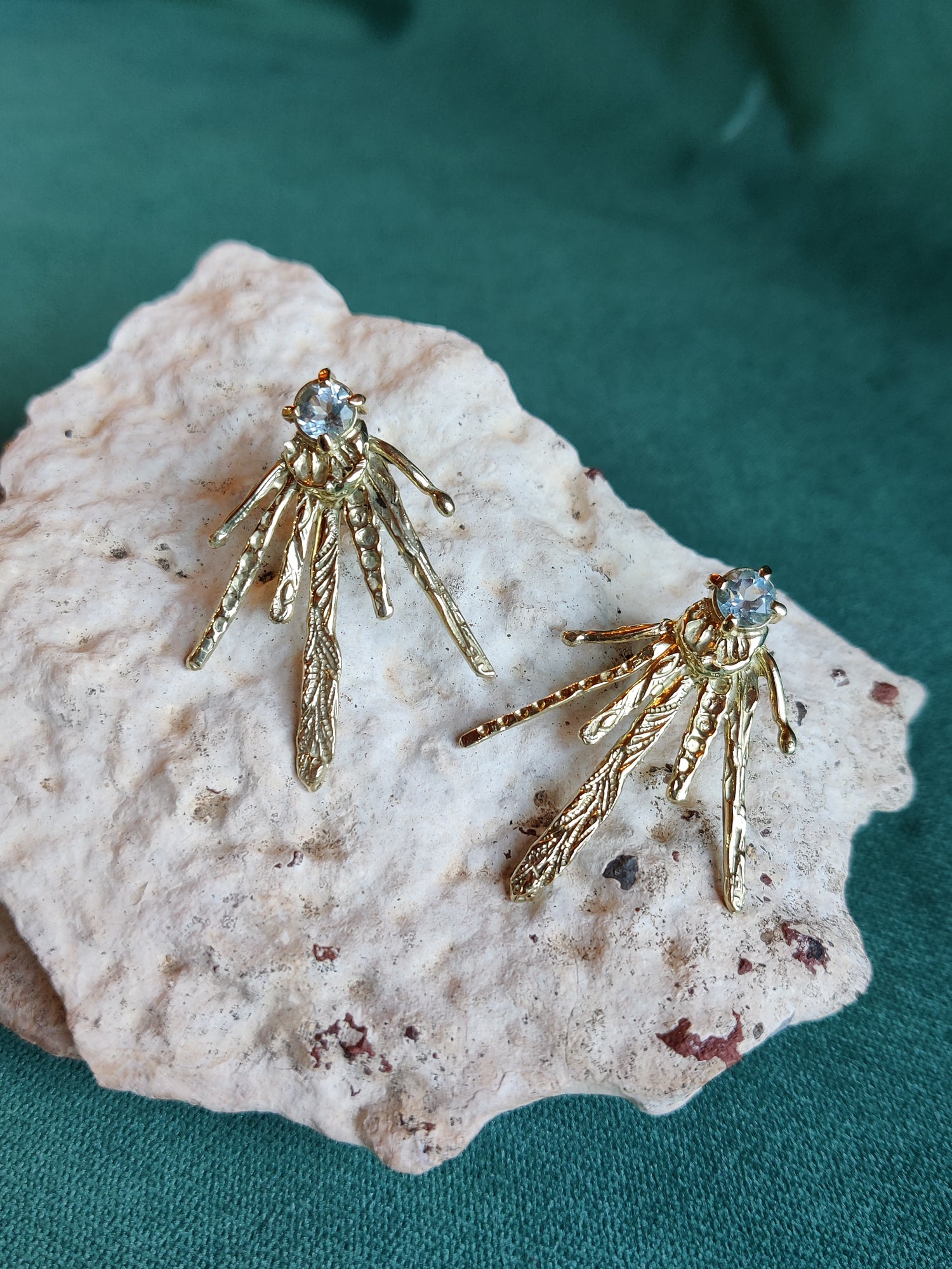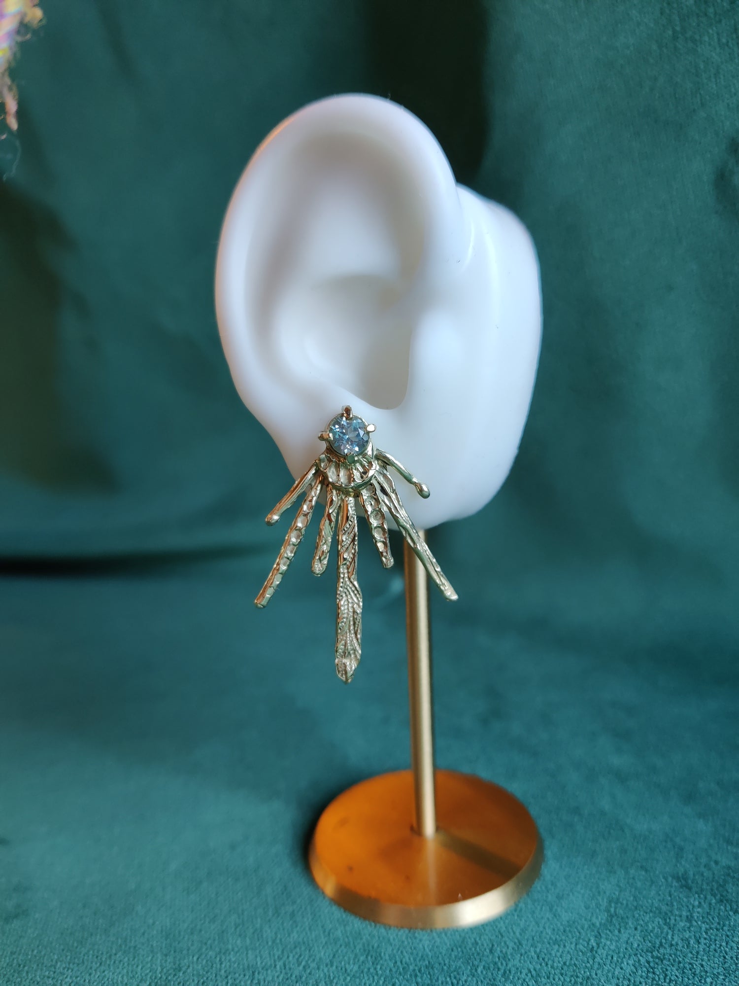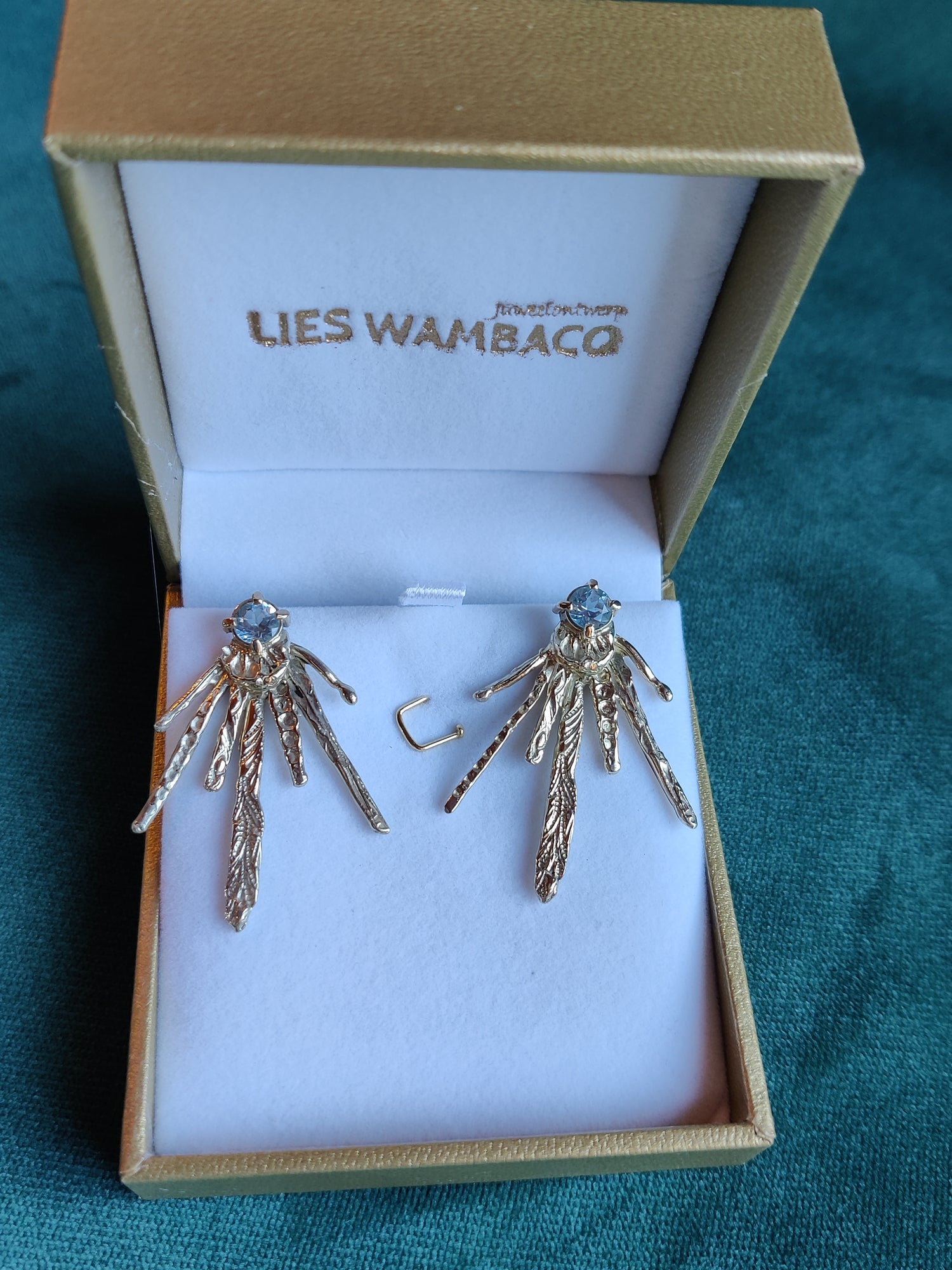 Oorbel in 14k geel goud met ronde topaas 5 mm. Het zijn fel blauwe edelstenen gezet in een stevige 14k geel gouden zetting, omringt door gouden stralen met een Lies motief.