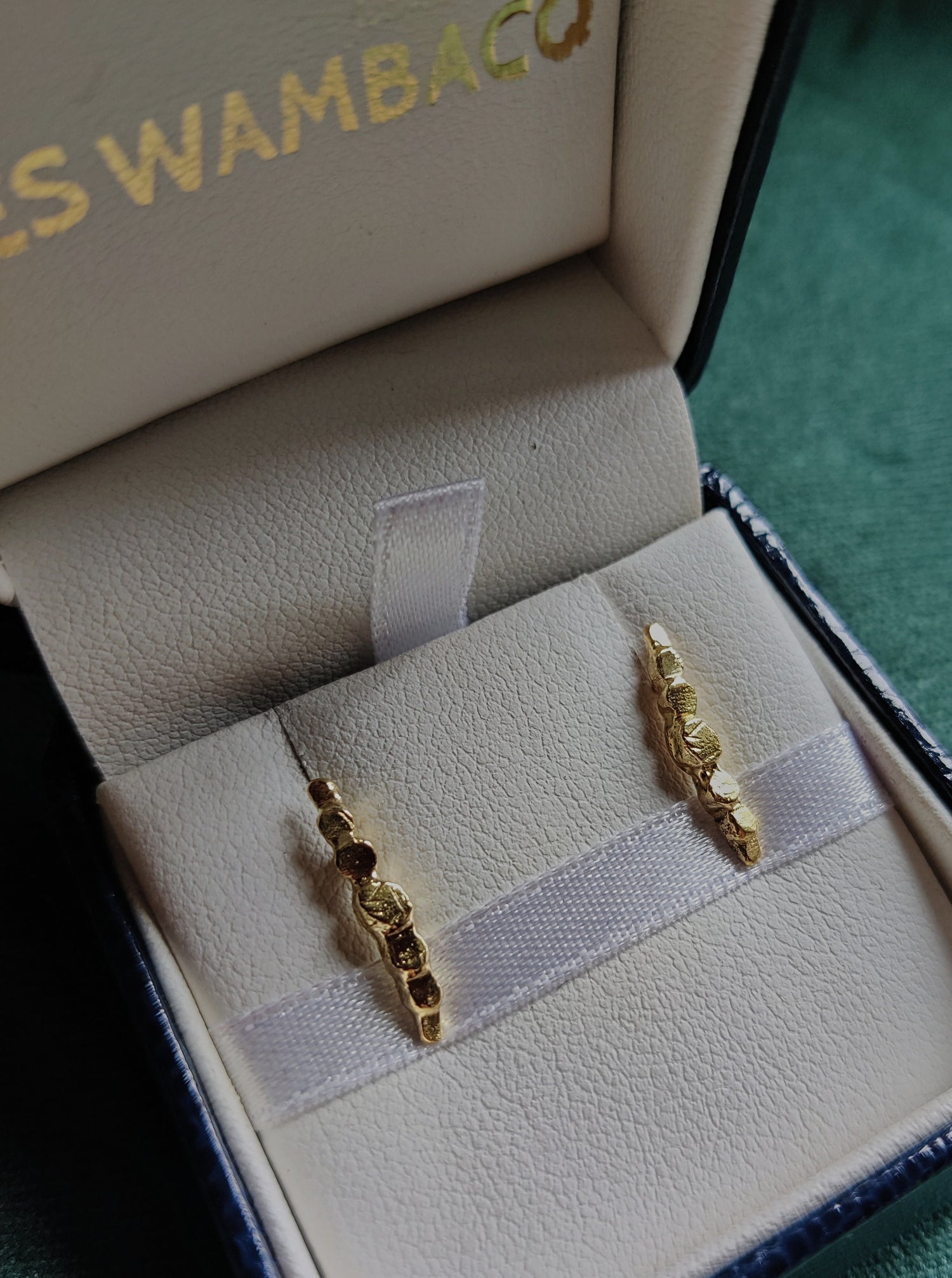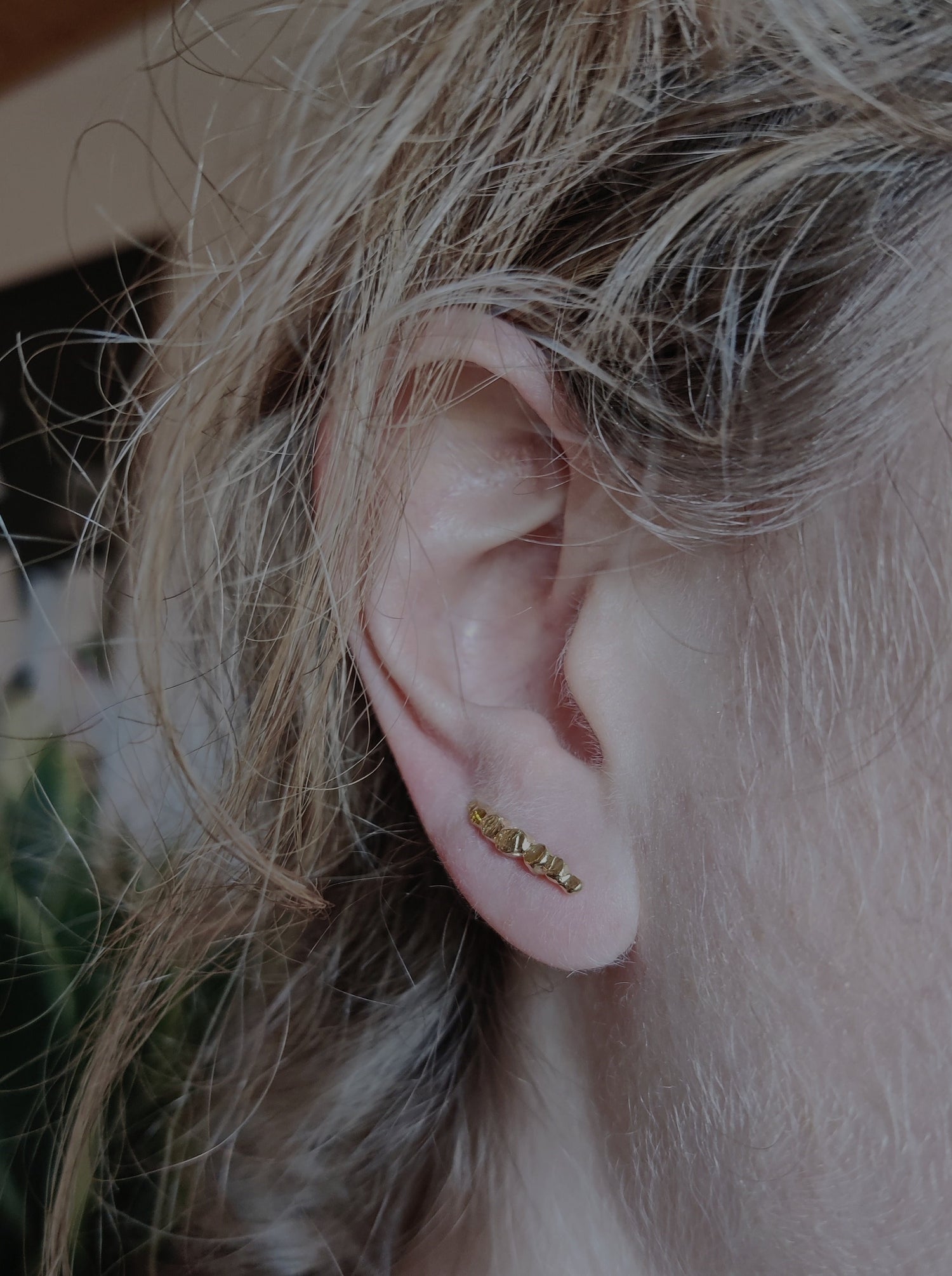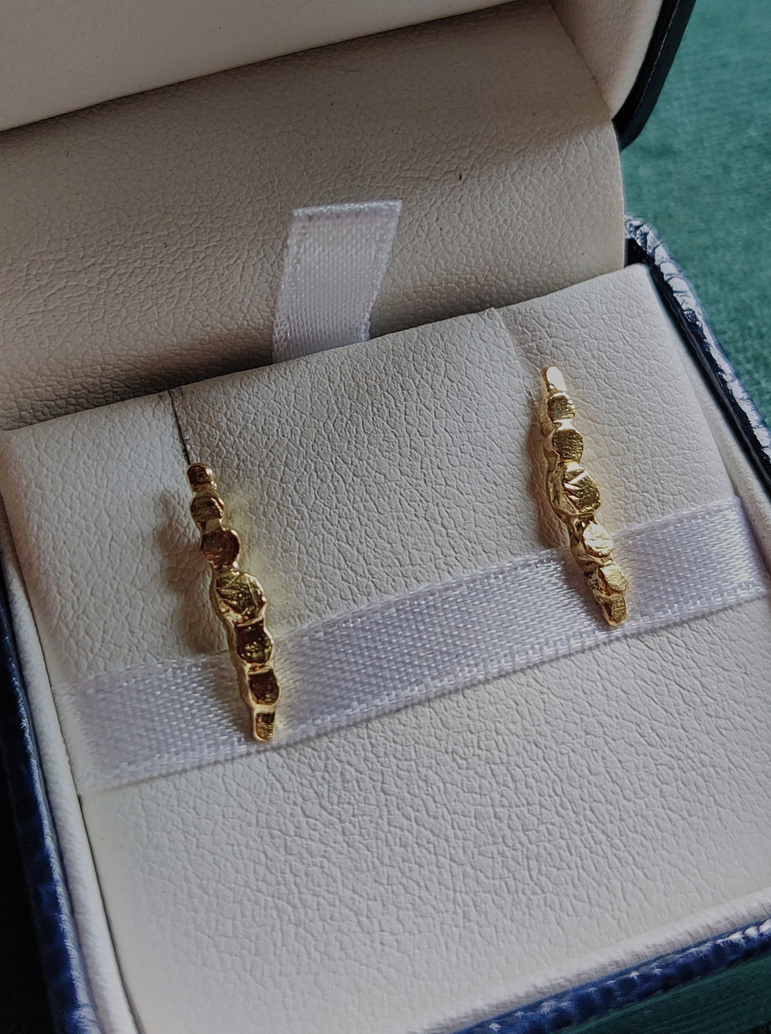 Oorbellen in 18K geel goud met organische vorm. Ze zijn van vol 18k geel goud gemaakt en je kan ze dragen met je oor mee of hangend. Het lijken wel kleine stukjes rots.