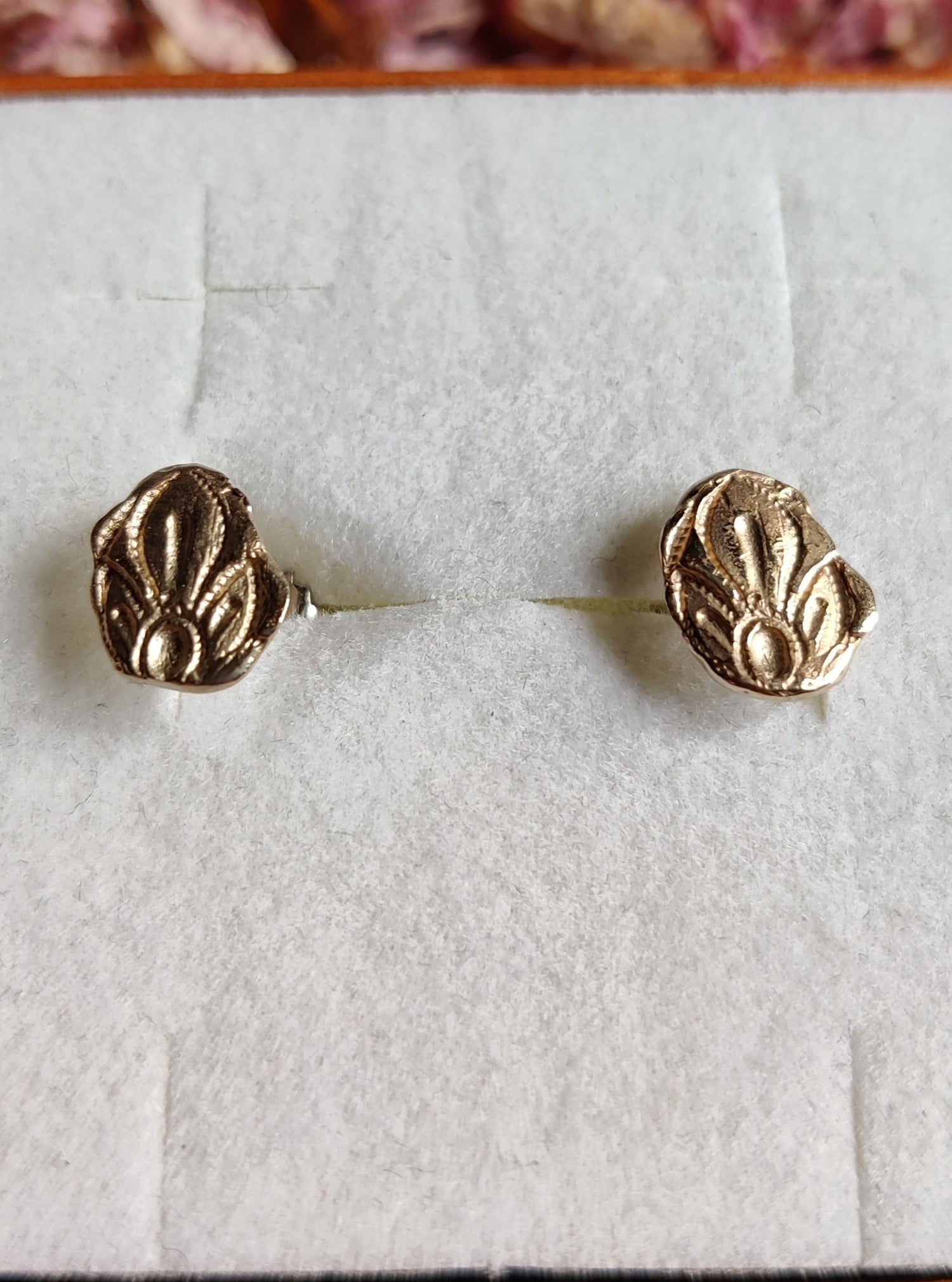 Het zijn wit gouden oorstekers met een uniek patroon in gegraveerd. Het zijn kleine stekertjes die je perfect elke dag kan dragen.