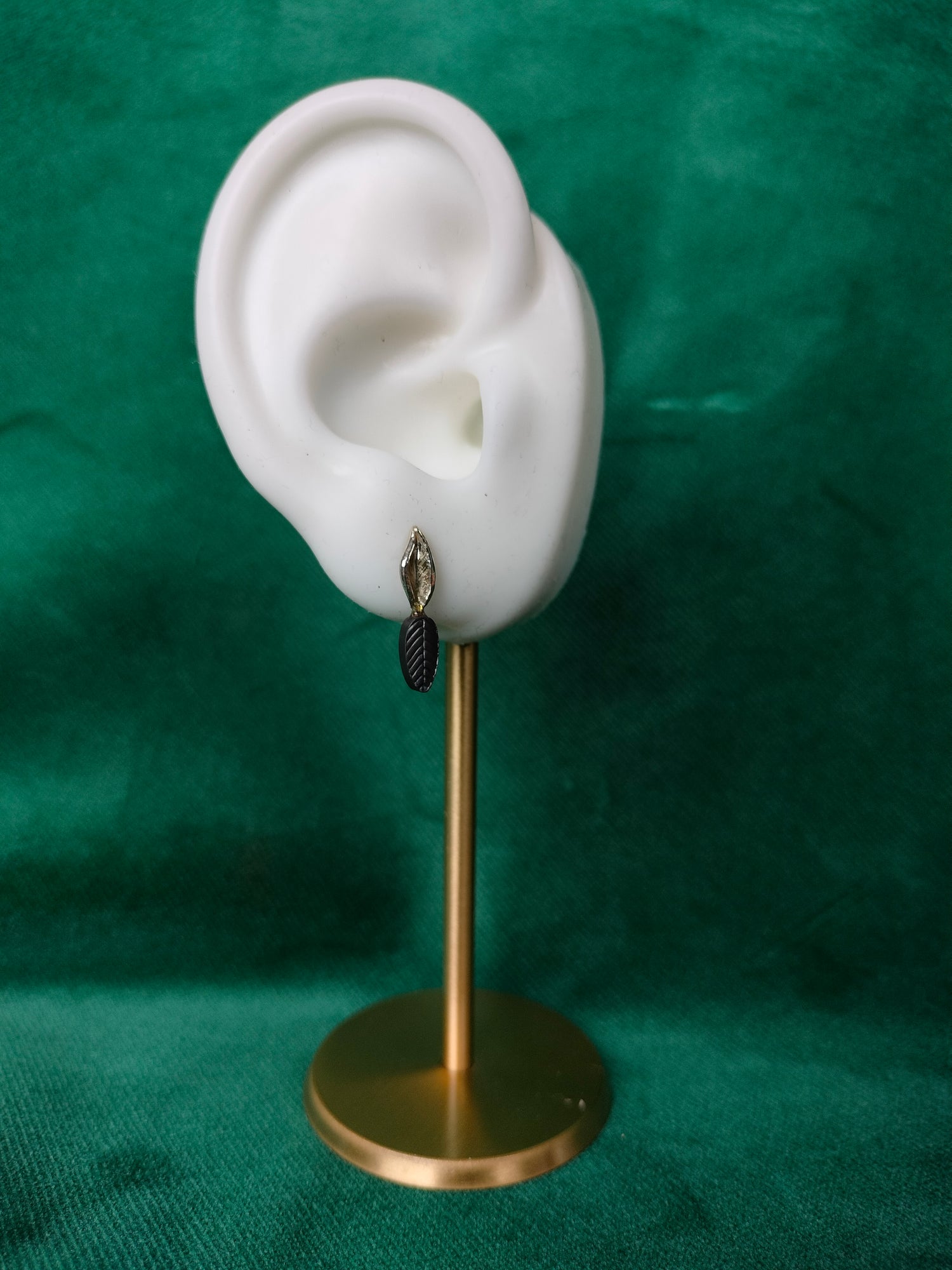 Oorstekers in zilver met een veertje in hematiet. Het blaadje / veertje is uitgesneden in de edelsteen hematiet.