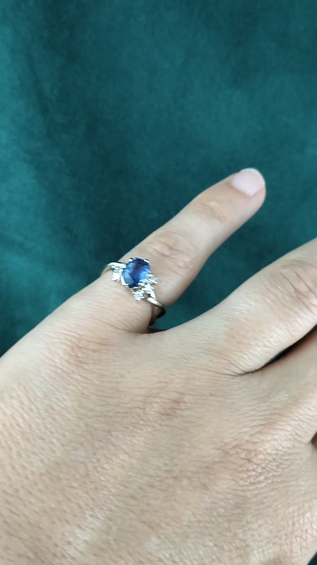 Een 18K wit gouden ring met een grote centrale saffier (1.26 ct 7.3x6mm) in een pootjes zetting met aan elke zijde drie diamantjes (1.8mm).