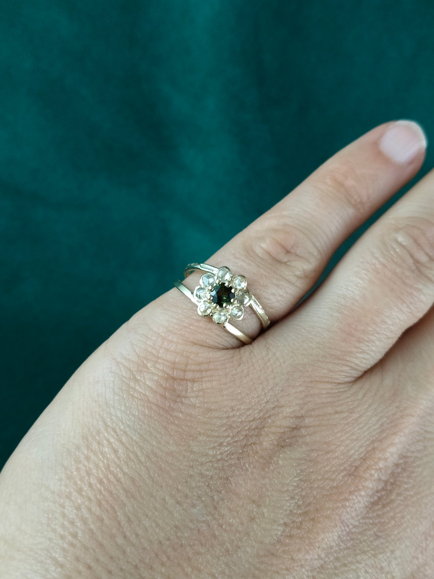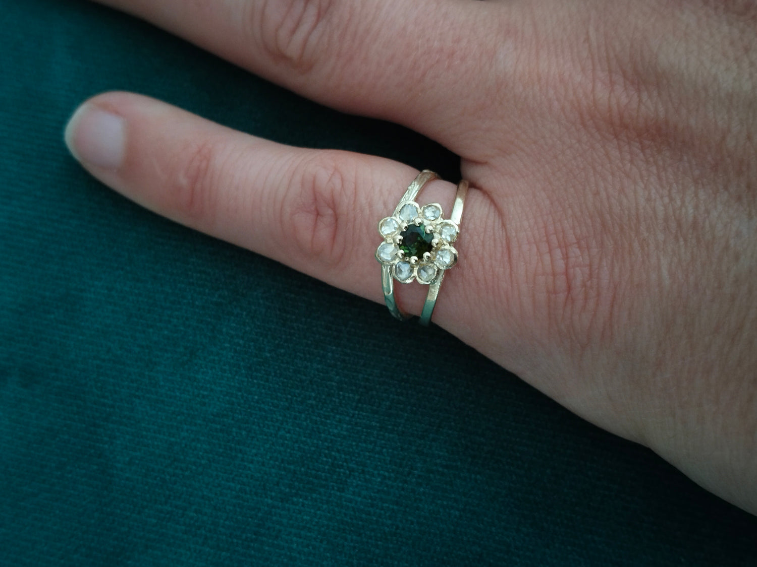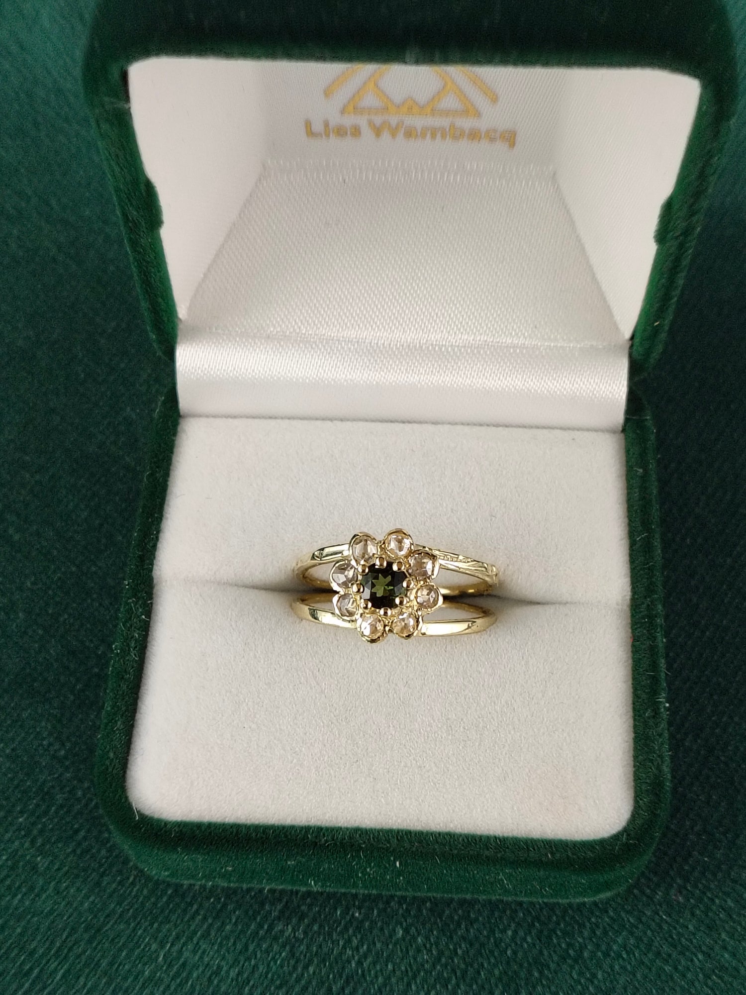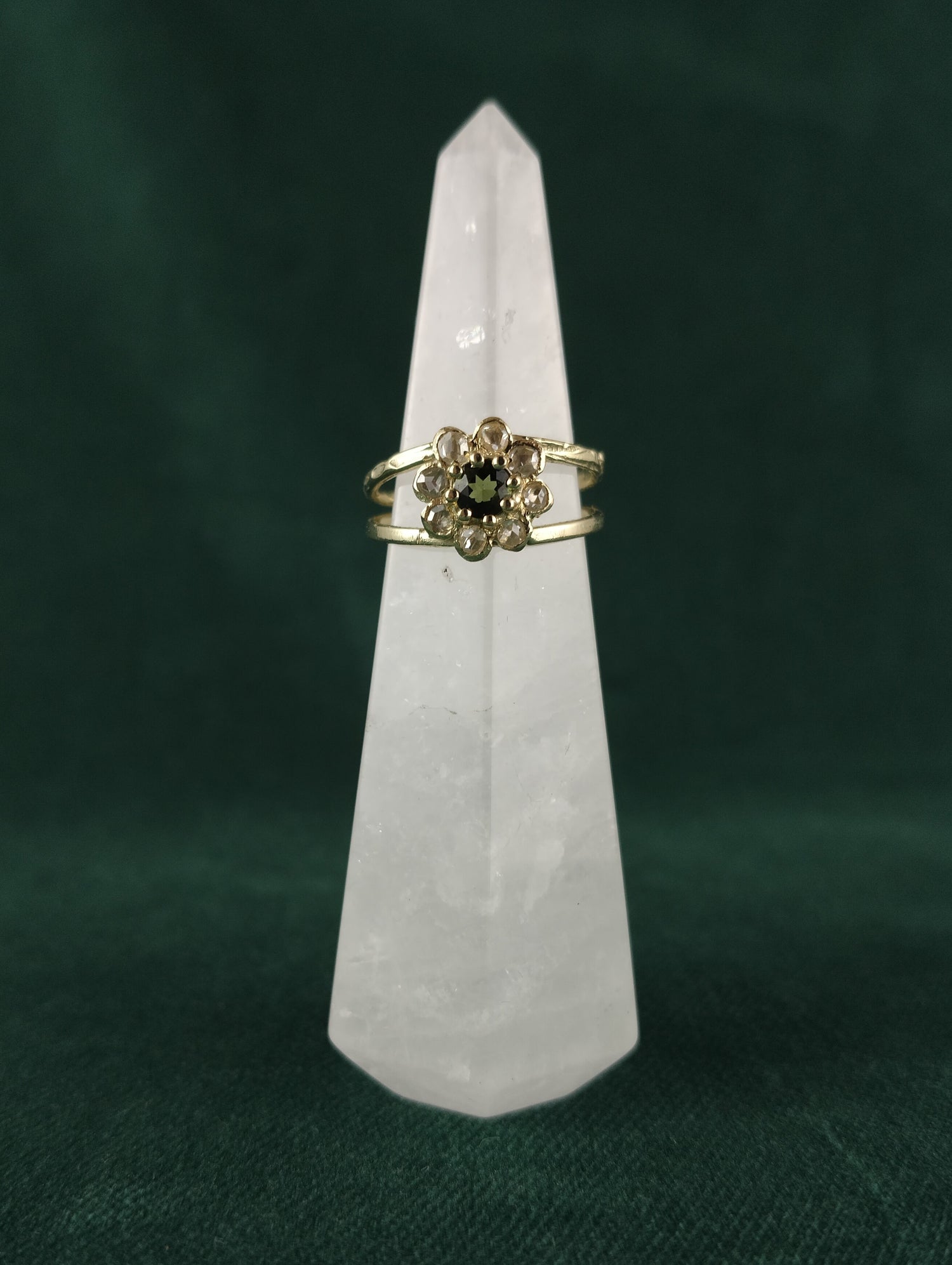 14K geel gouden ring met een groene toermalijn van 4mm en 8 x roosgeslepen diamanten van 2 mm in een bloemvorm.