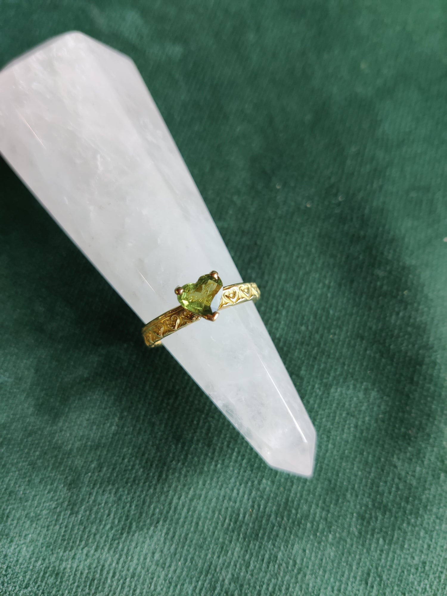 14k geel gouden ring met een groen saffieren hartje (6mm). De ring heeft ook aan de achterzijde een gouden hartje en het bandje is bedrukt met een hartjes motief.