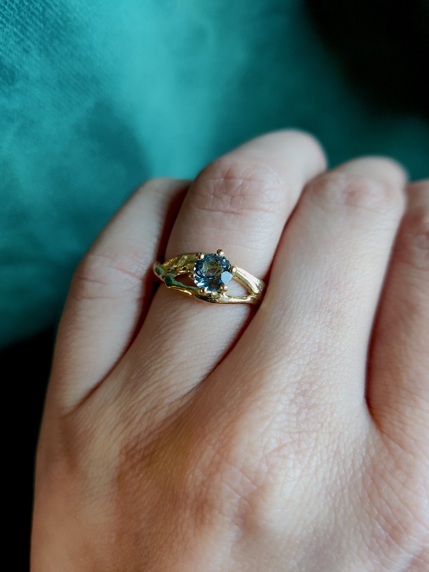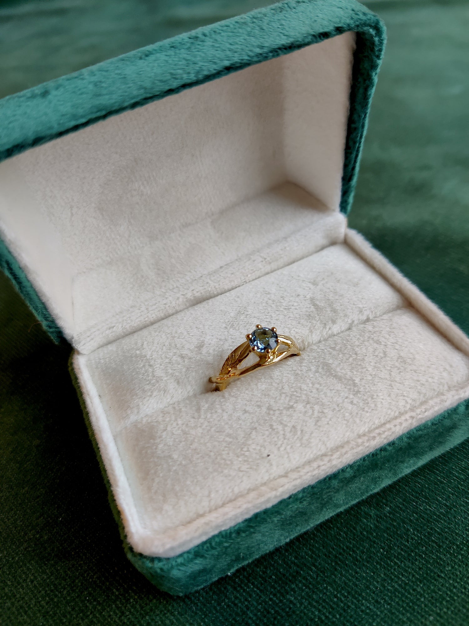 Een fijne geelgouden ring met een ronde lichtblauwe aquamarijn.