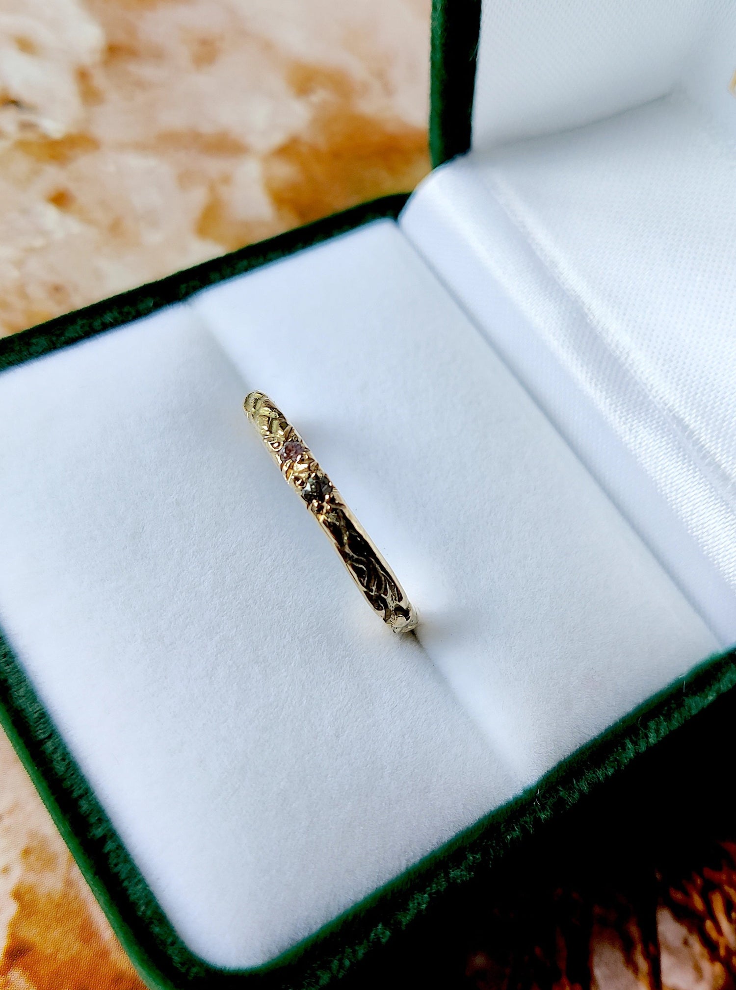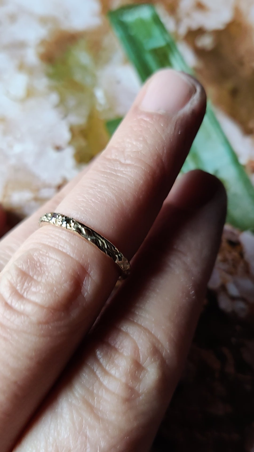 E. werd op haar verjaardag naar het atelier gelokt door haar man B. Ze mocht een juweel laten samenstellen dat hun familie samenvat. Ze koos voor een ring met een Keltisch patroon (voor haar Ierse man) waar we een groen en paars steentje in vast zetten, symbool voor hun twee kindjes. De namen van de kindjes zijn gegraveerd aan de binnenkant.