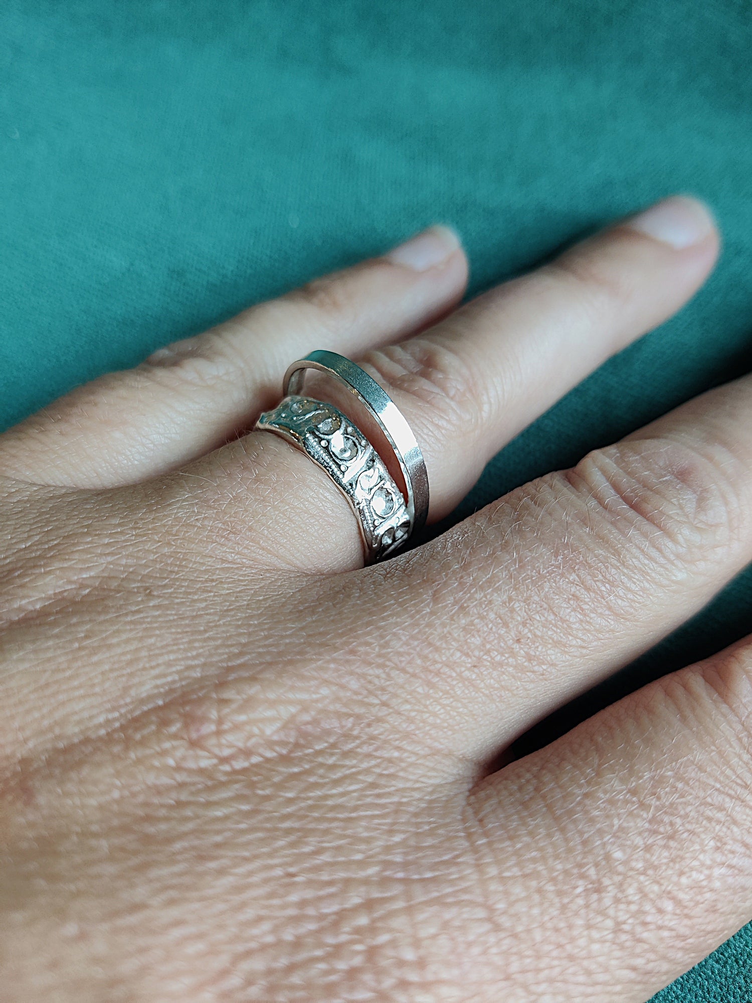 Zilveren ring met twee banden: één band met een fijn patroon en één gladde band.
