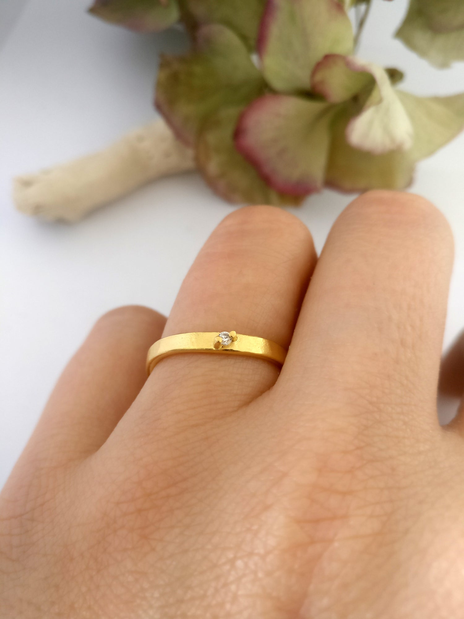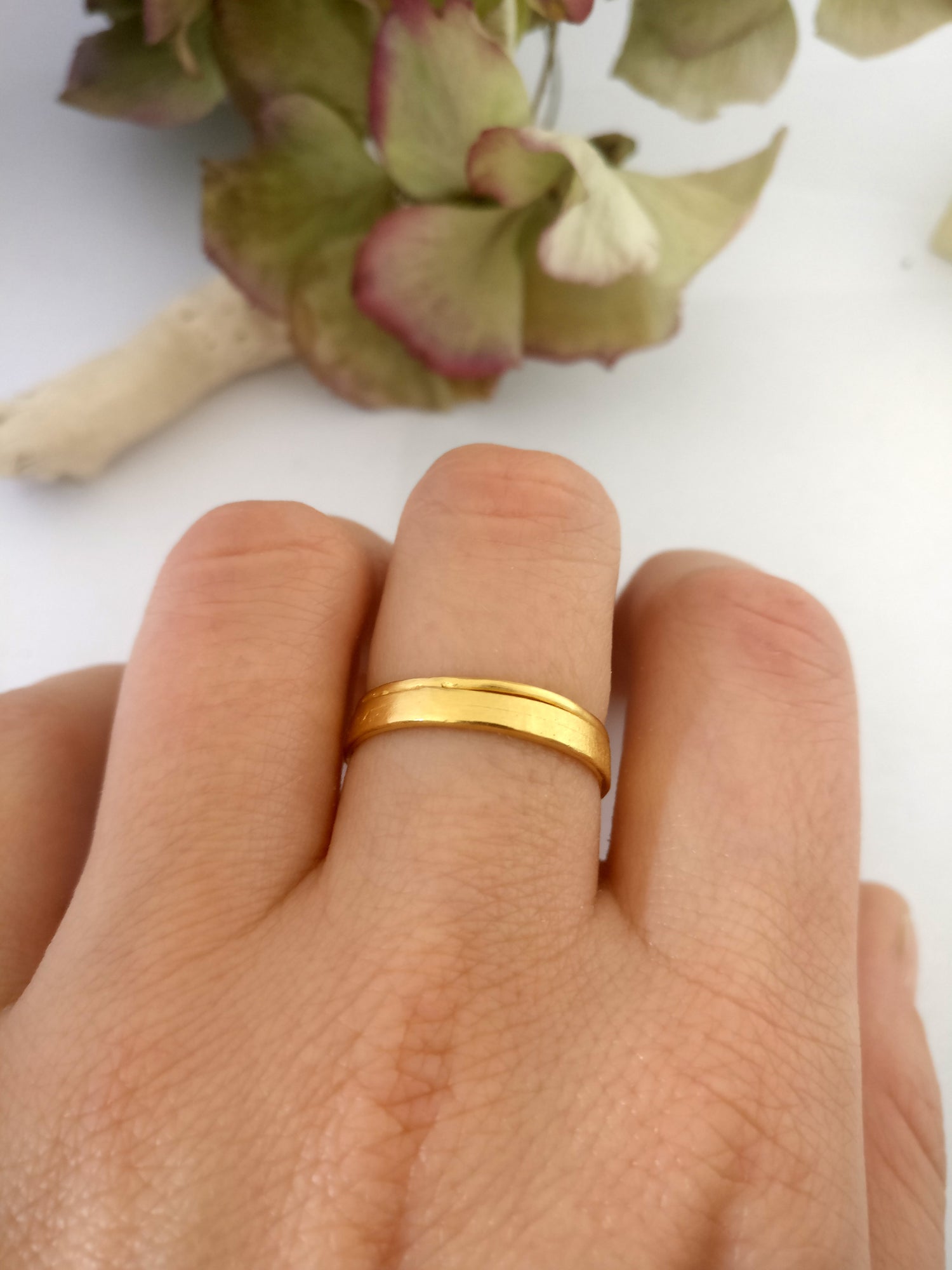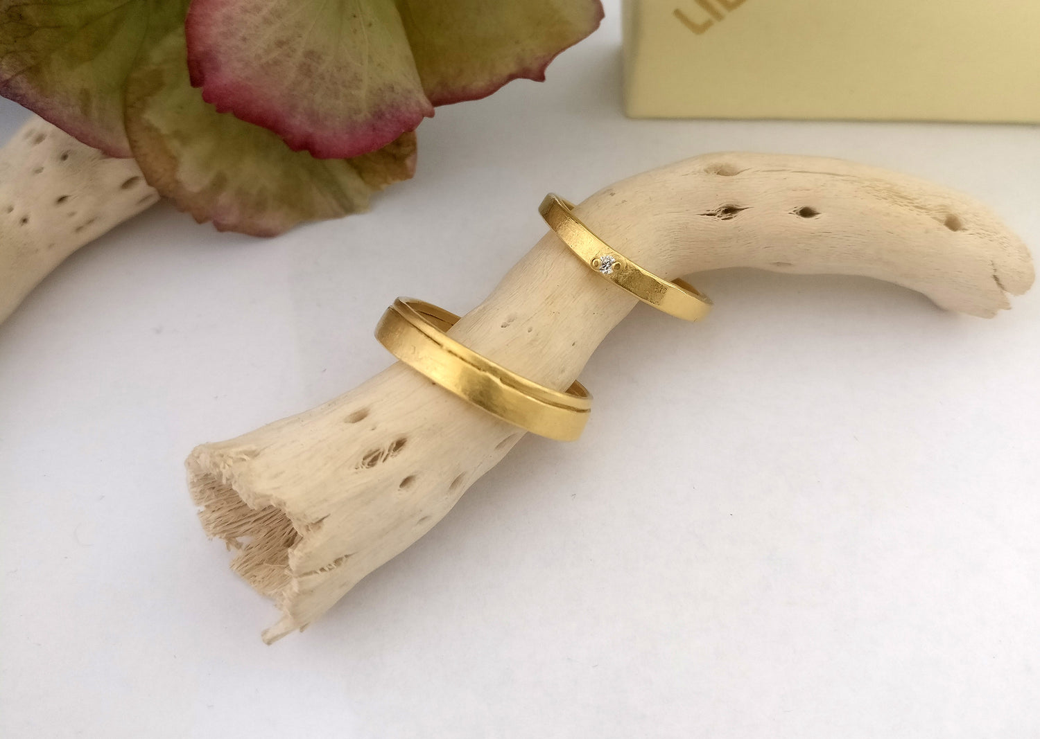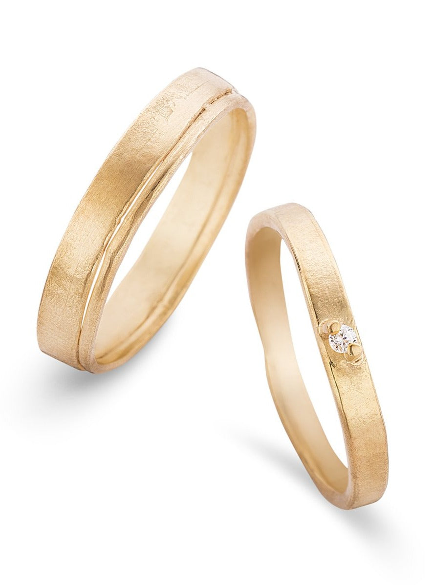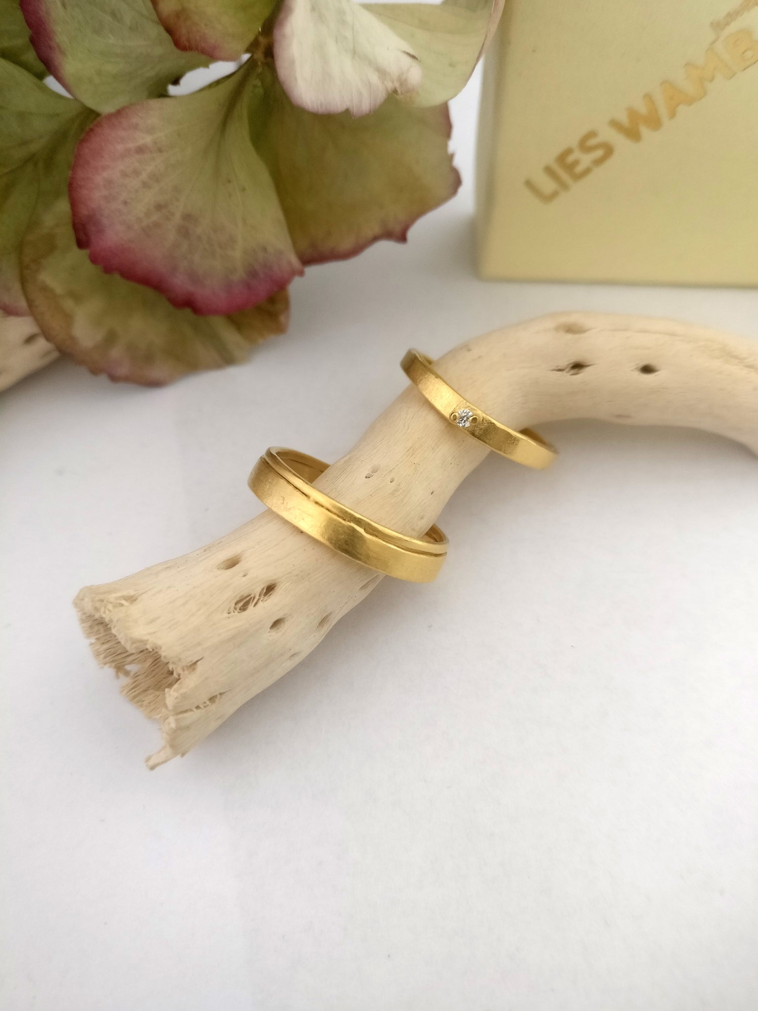 Het zijn matte trouwringen. In de trouwring voor haar zit er een klein diamantje bovenop de band voor extra schittering. De herenring werd afgewerkt met een extra bandje.