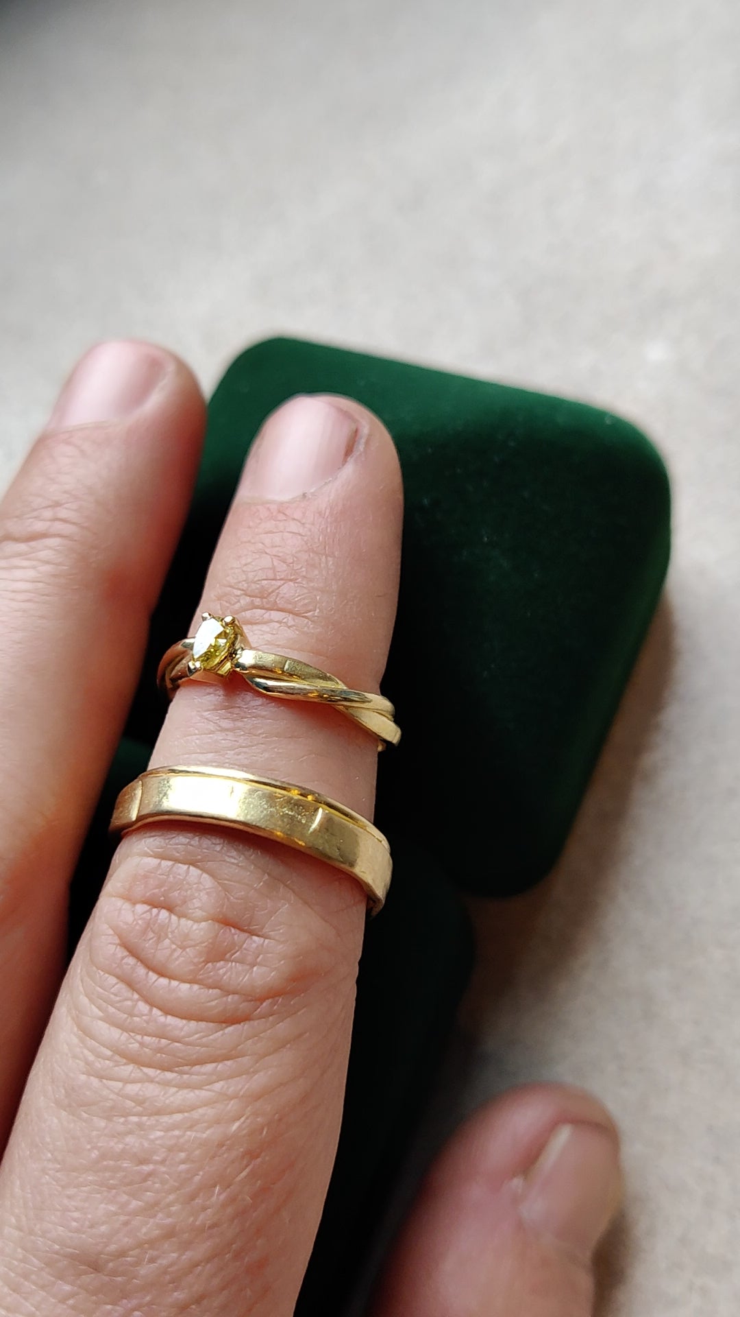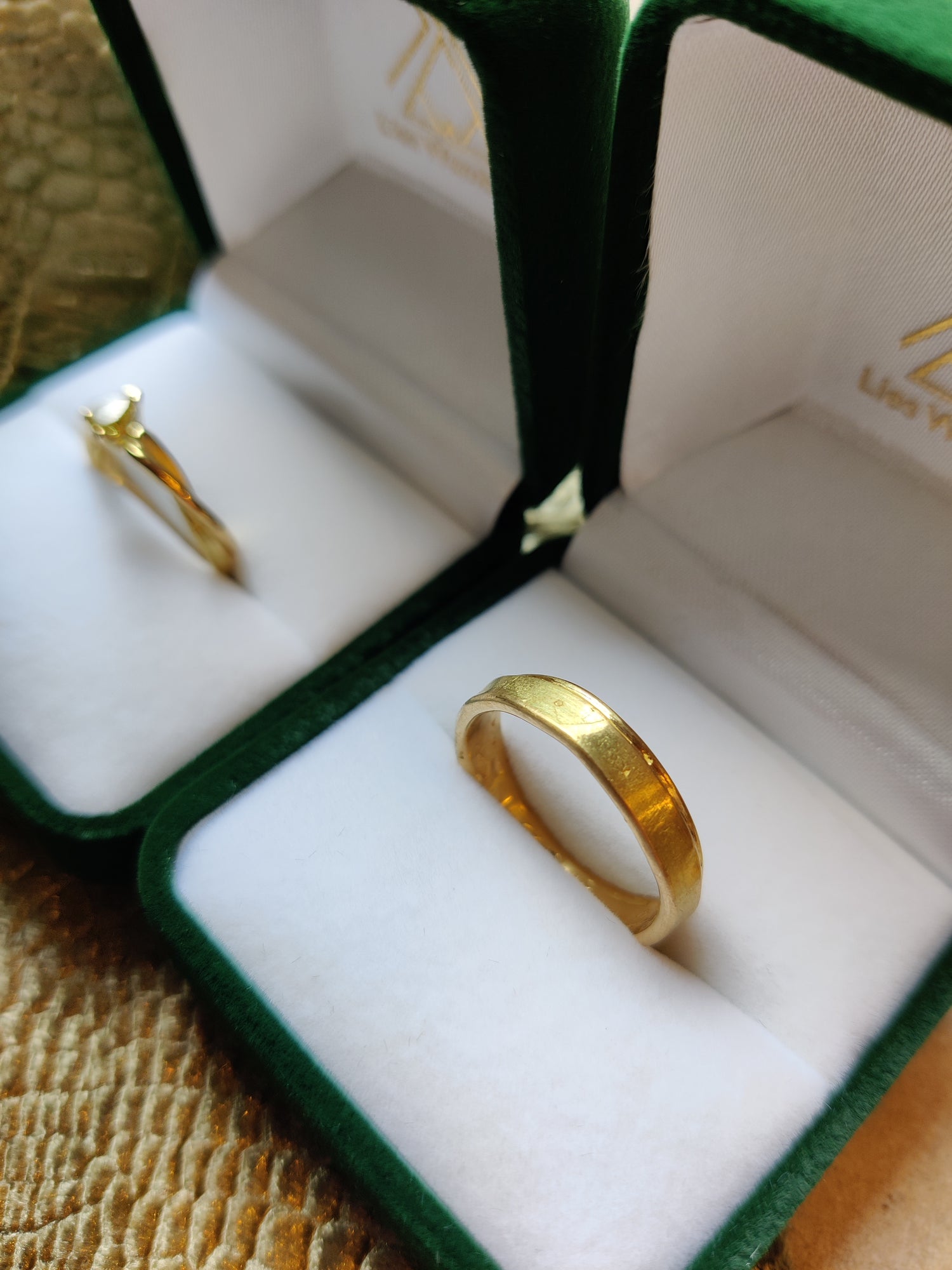 Ze wouden een trouwring die een beetje een ruwe uitstraling heeft voor hem, maar iets verfijnder voor haar. Ze gingen voor een gedraaide ring met een prachtige lichtgroene steen.