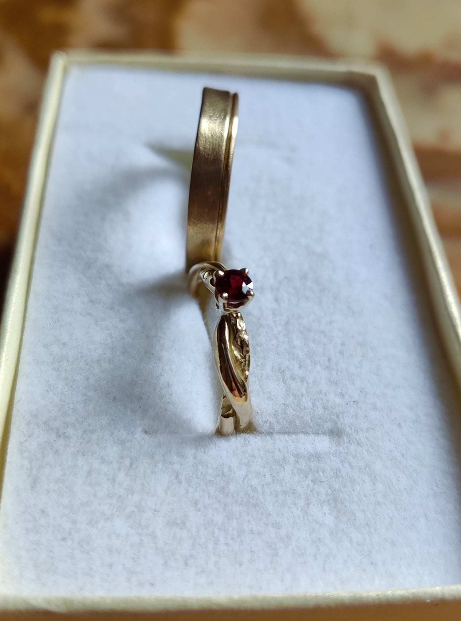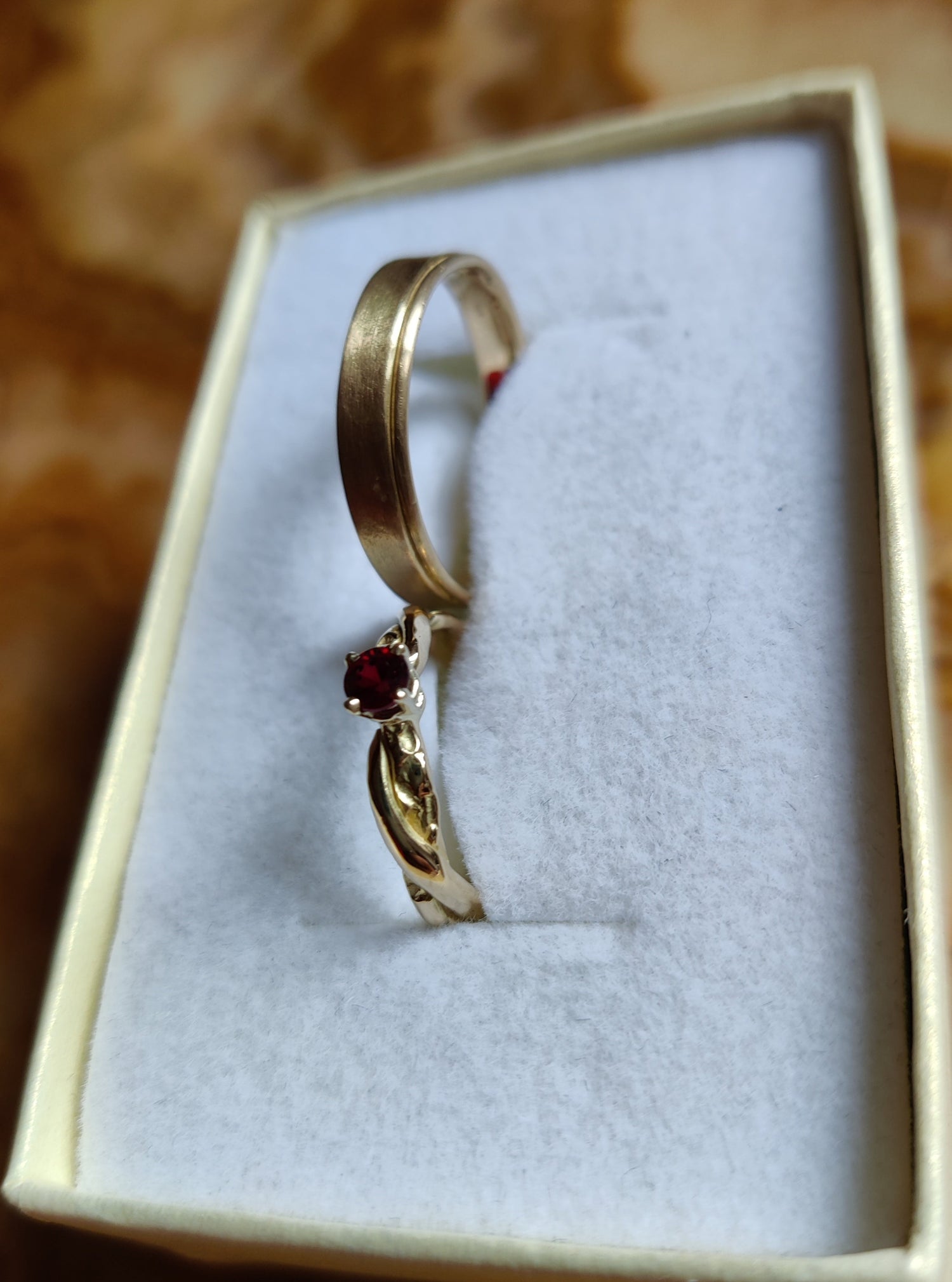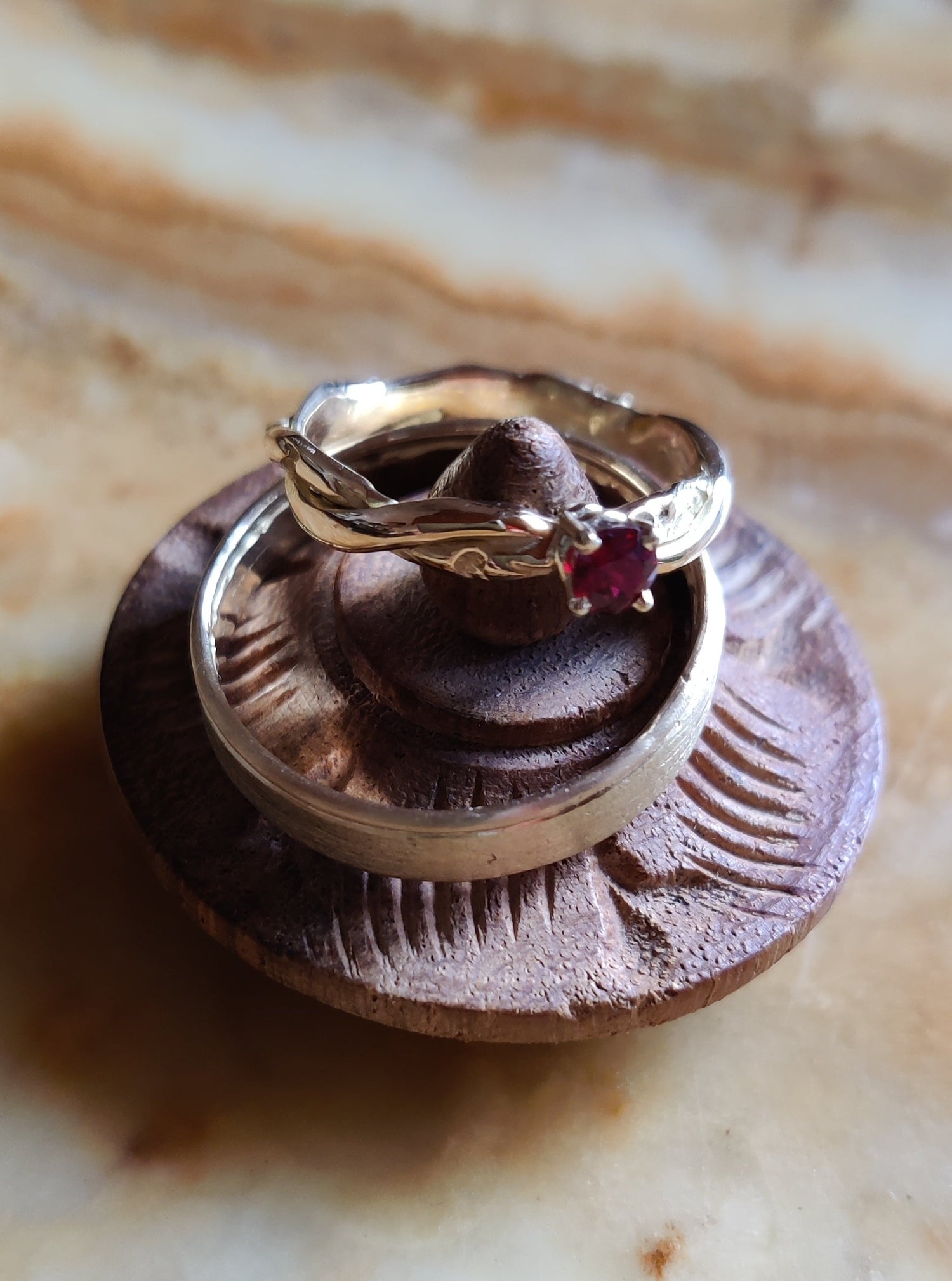 Nu ze ging trouwen met G. koos ze vol vertrouwen om een paar ringen door mijn hand te laten maken. Ze ging voor een niet voor de hand liggende keuze: een rode robijn in haar trouwring. Maar het resultaat mag er zijn. Haar ring is een ring om bij weg te dromen geworden.