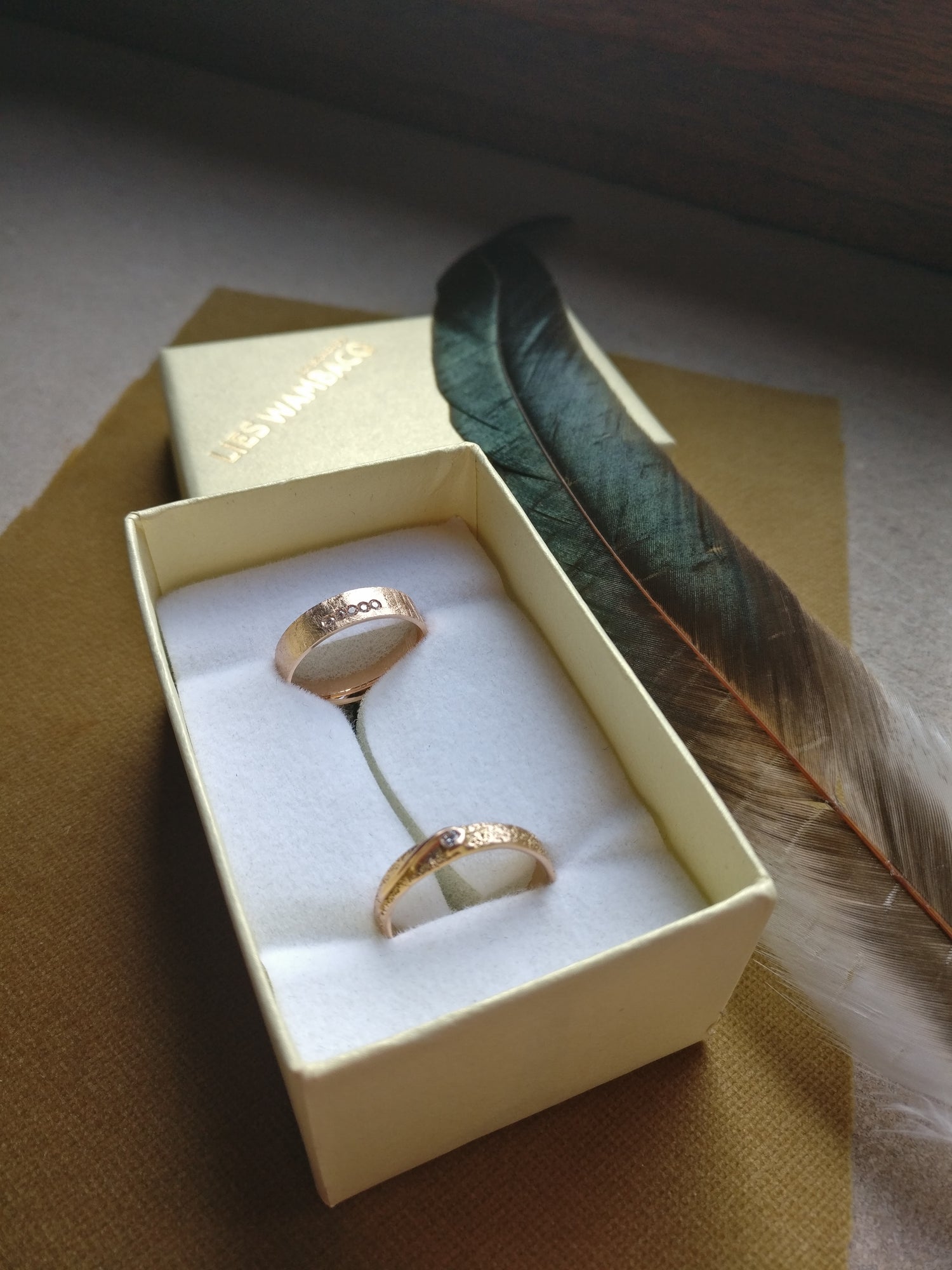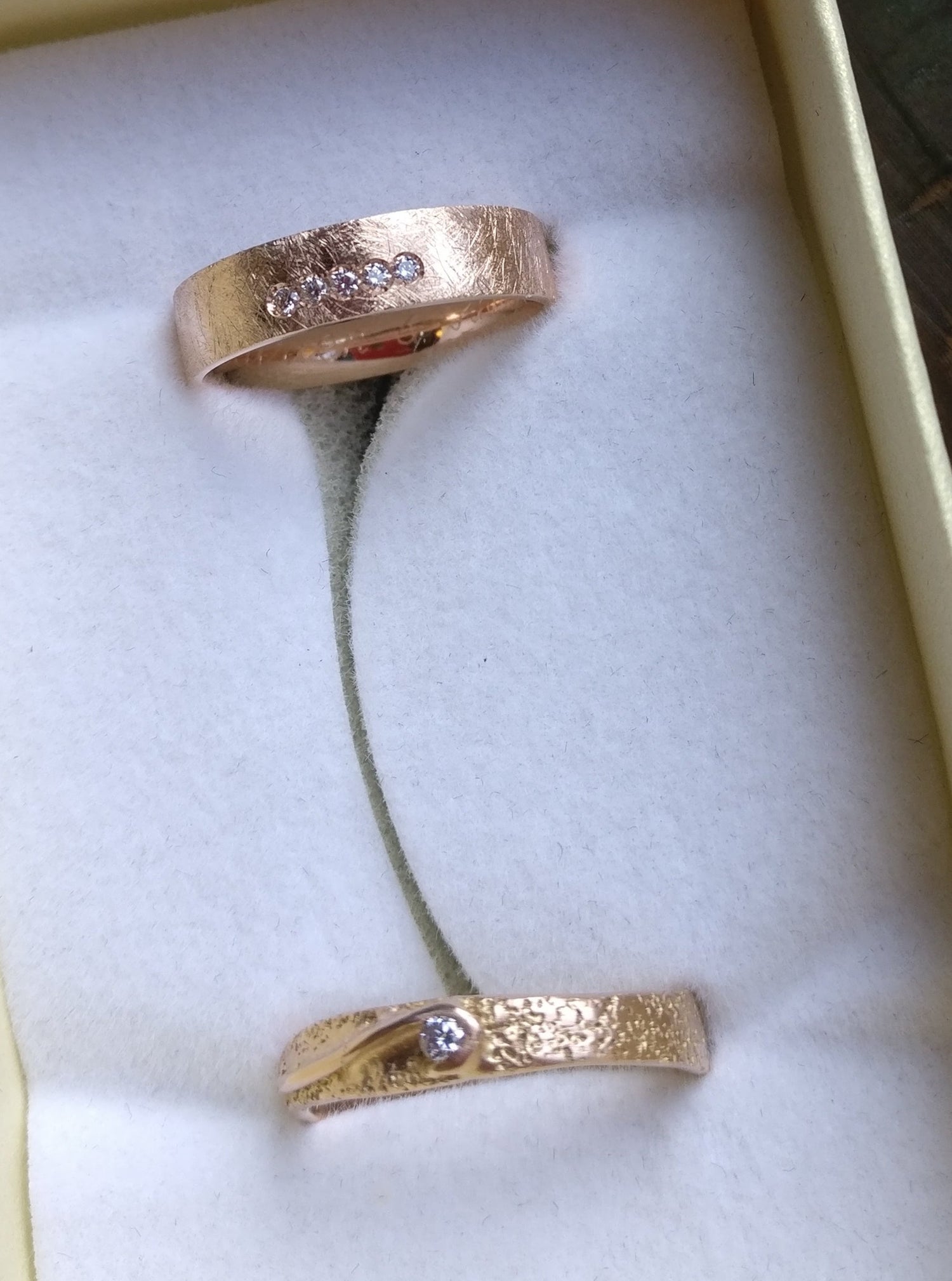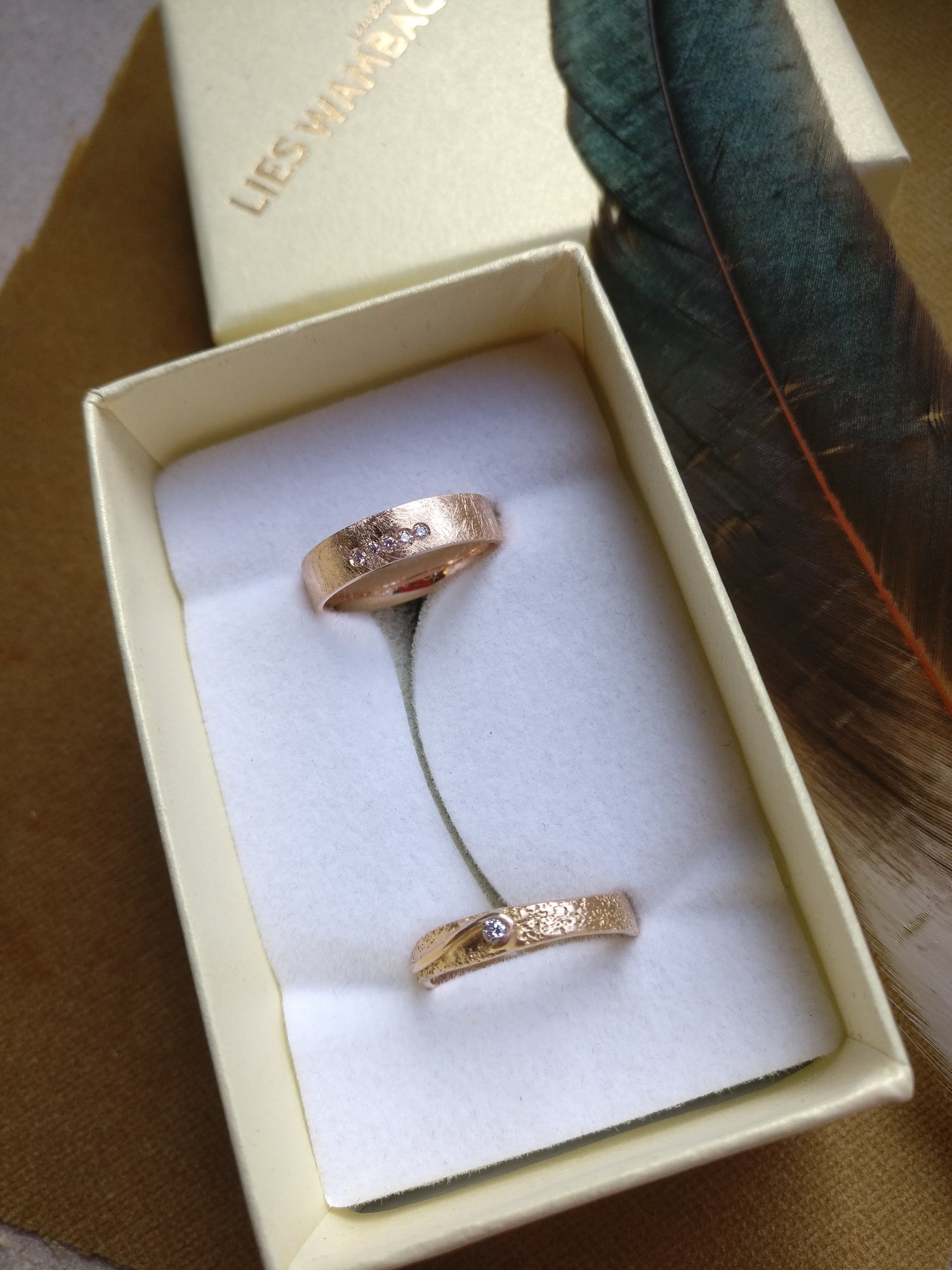 Trouwringen voor K. en A. De ring voor K. is de Helena ring, maar met een kronkel die de diamant omarmd. De ring voor A. is de Johnny ring, maar dan met steentjes zoals Isabella.