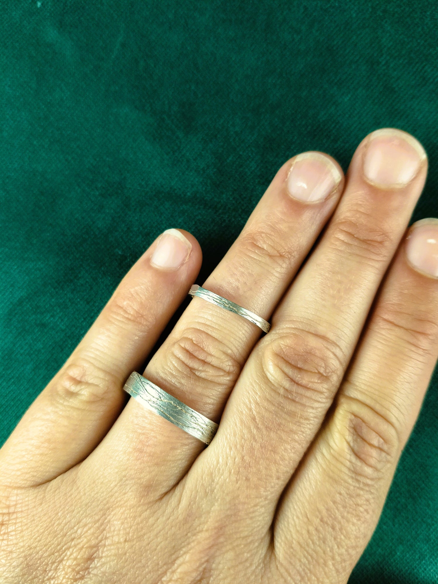 De namen van deze trouwringen zijn Orphus en Eurydice. Het zijn matte trouwringen met fijne lijntjes.