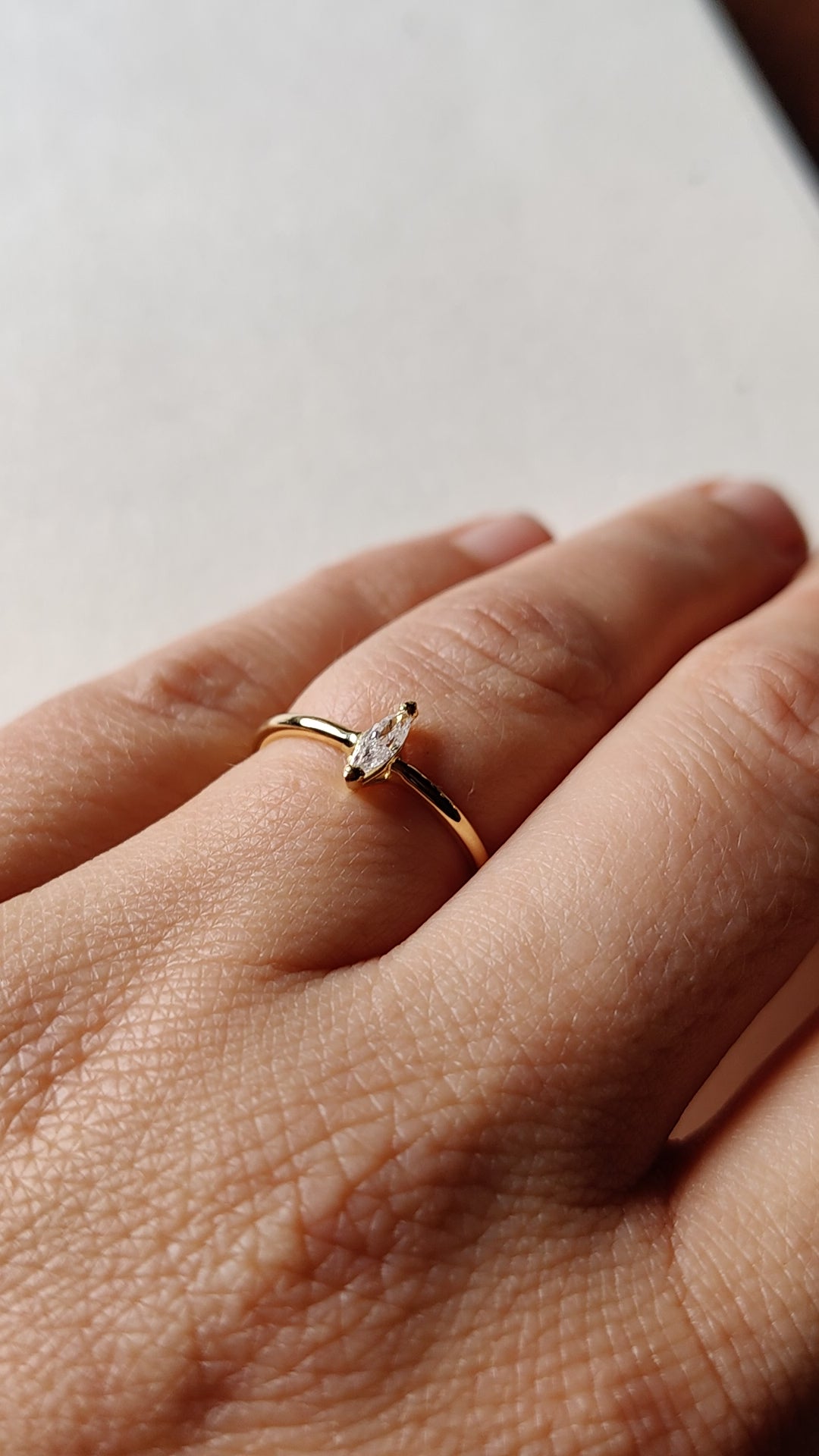 Het is een geel gouden ring met een speciale diamant. Een markies geslepen diamantje op een fijn geel gouden draadringetje.