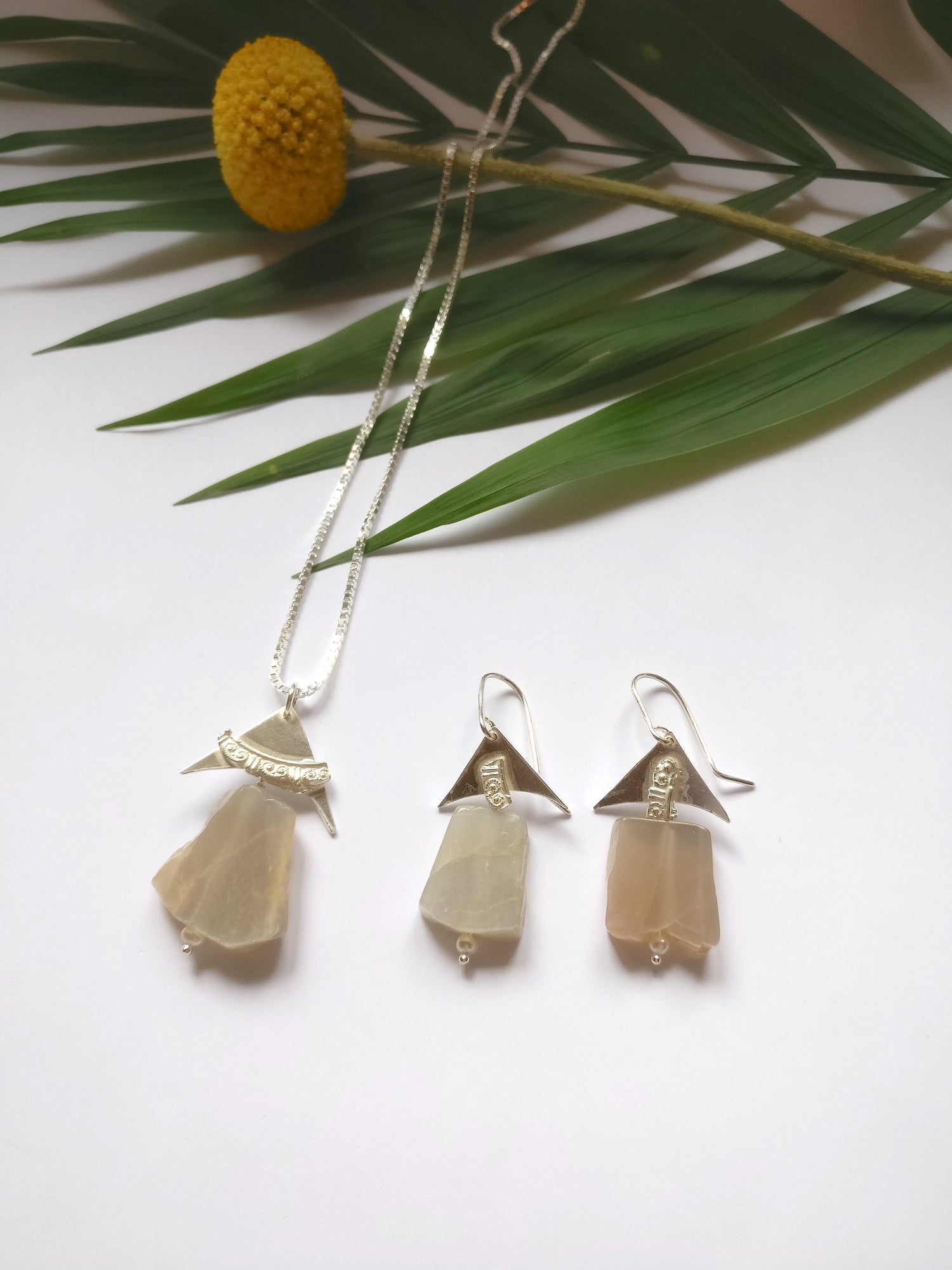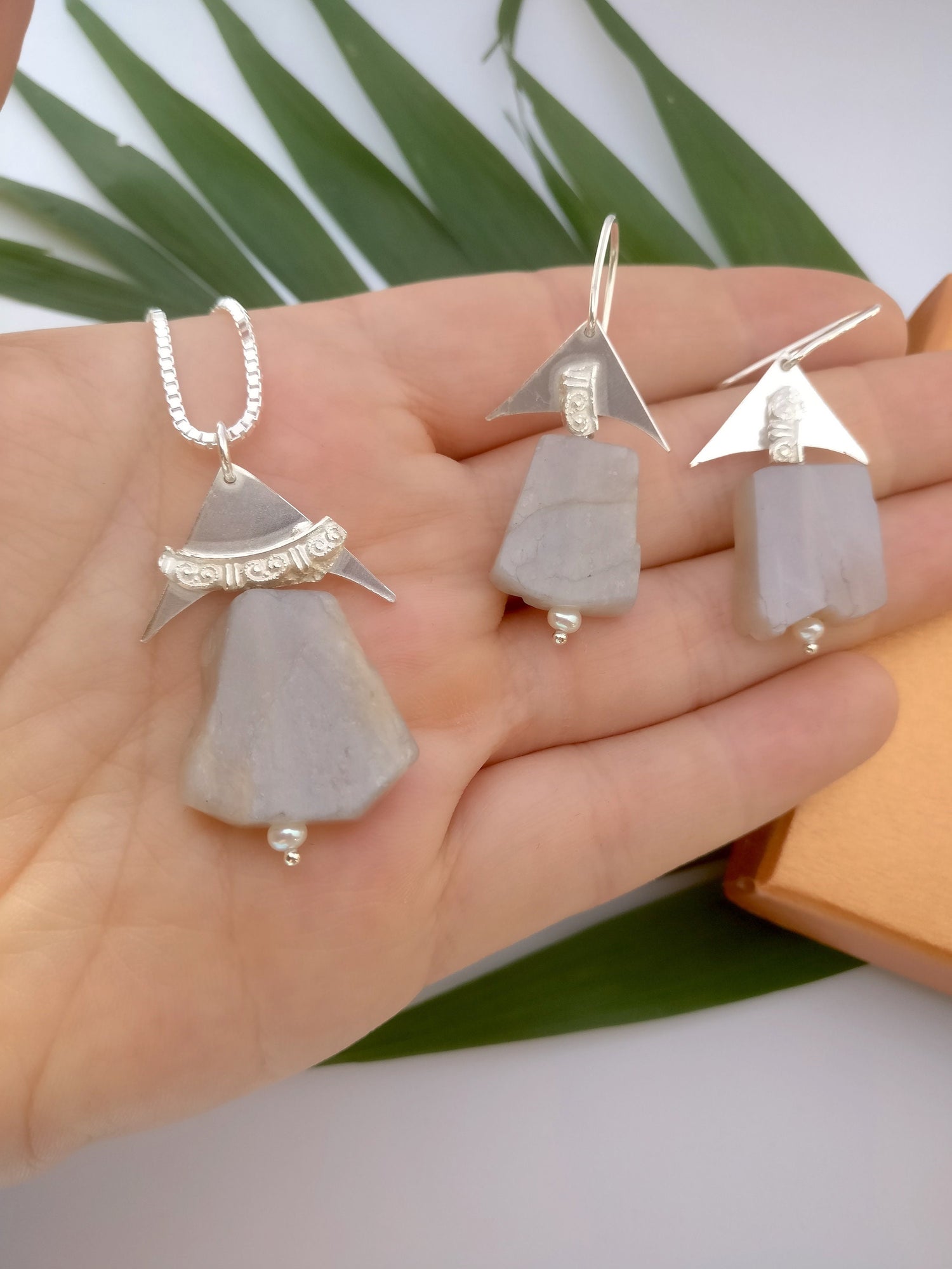 Set van ketting en oorbel in zilver met grijze maansteen en witte parels: Luna